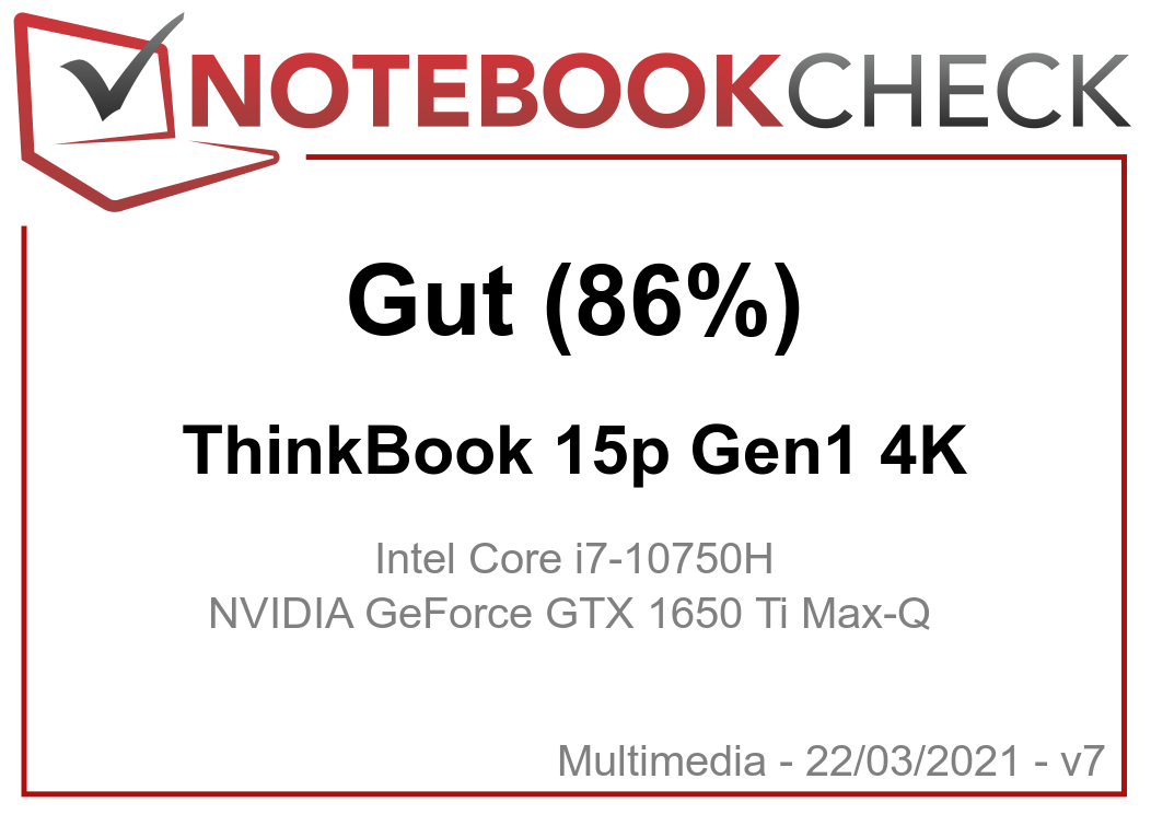 | 86.4 % v7 (old) | 03 / 2021 | Lenovo ThinkBook 15p Gen1 4K i7-10750H, GeForce GTX 1650 Ti Max-Q | 2 kg | 19.9 mm | 15.60" | 3840x2160 | |