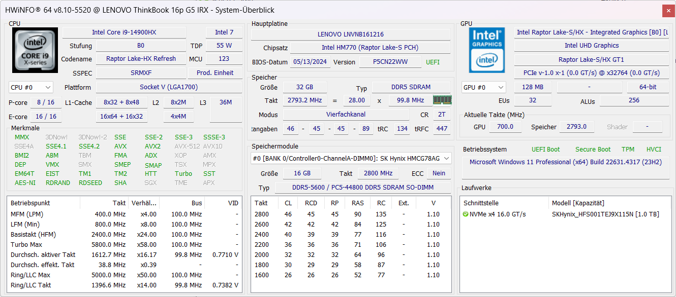 | Lenovo ThinkBook 16p G5 IRX 21N50011GE Intel Core i9-14900HX ⎘ NVIDIA GeForce RTX 4060 Laptop GPU ⎘ 32 GB RAM, 1024 GB SSD | Listenpreis 2120 Euro Geizhals Suche | 2.2 kg | 23.1 mm | 16.00" 3200x2000 236 PPI IPS LCD | |