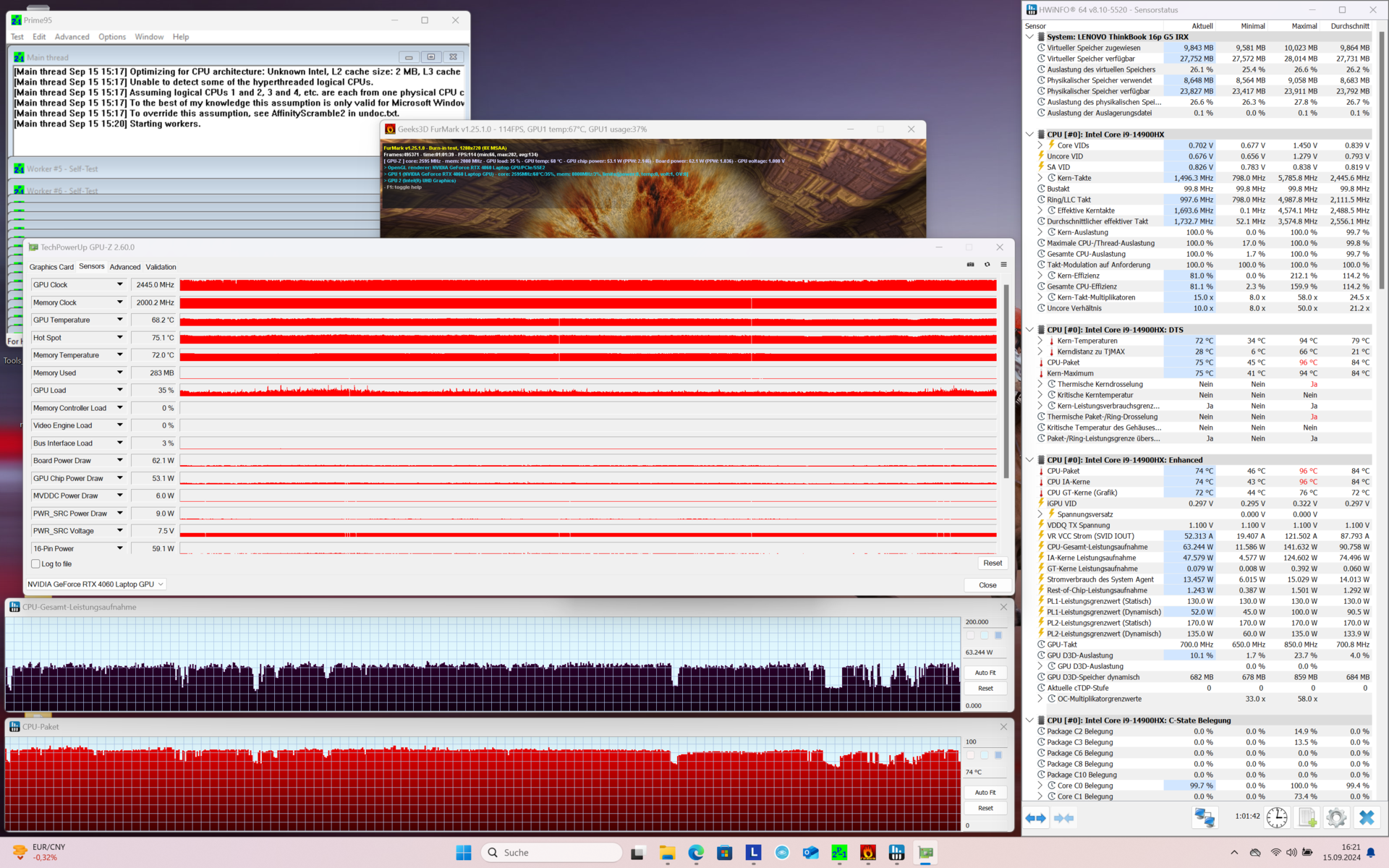 | Lenovo ThinkBook 16p G5 IRX 21N50011GE i9-14900HX, GeForce RTX 4060 Laptop GPU, SK Hynix HFS001TEJ9X115N, IPS LCD, 3200x2000, 16" | Lenovo ThinkBook 16p G3 ARH R9 6900HX, GeForce RTX 3060 Laptop GPU, Micron 3400 1TB MTFDKBA1T0TFH, IPS, 2560x1600, 16" | Asus ProArt P16 H7606WI Ryzen AI 9 HX 370, GeForce RTX 4070 Laptop GPU, Micron 2400 MTFDKBA1T0QFM, OLED, 3840x2400, 16" | Honor MagicBook Pro 16 2024 Ultra 7 155H, GeForce RTX 4060 Laptop GPU, WD PC SN740 SDDPNQD-1T00, IPS, 3072x1920, 16" | Framework Laptop 16 R9 7940HS, Radeon RX 7700S, WDC PC SN810 1TB, , 2560x1600, 16" | Lenovo ThinkPad P1 Gen 7 21KV001SGE Ultra 7 155H, GeForce RTX 4060 Laptop GPU, Kioxia XG8 KXG8AZNV1T02, IPS LED, 2560x1600, 16" | Durchschnittliche NVIDIA GeForce RTX 4060 Laptop GPU | Durchschnitt der Klasse Multimedia | |