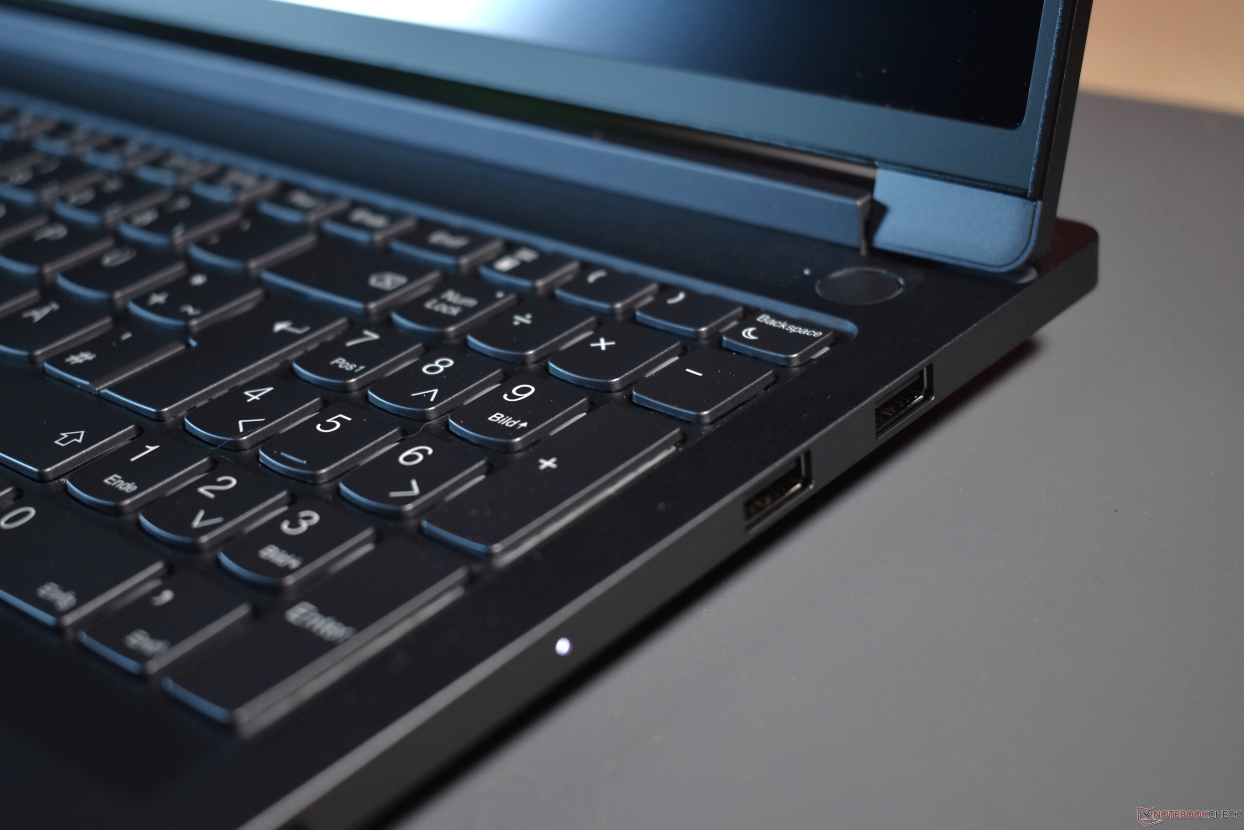 Das farblich ans Gehäuse angepasste Keyboard verfügt über eine zweistufige weiß-blaue Tastaturbeleuchtung, die auch einen Auto-Modus bietet. Die Chiclet-Tasten haben einen Hubweg von 1,5 Millimetern und genau wie die meisten Lenovo-Laptops ein abgerundetes Profil. Die Tastatur ist in einem sinnvollen Layout ausgeführt, bietet auch Pfeiltasten in einer angemessenen Größe, sodass man auf dieser Tastatur ohne Probleme gerne lange Texte tippt. Für Nutzer, die viele Zahlen eingeben, verbaut Lenovo zudem einen Ziffernblock. Die Tasten des Nummernblocks sind wesentlich kleiner, doch die Funktion ist natürlich trotzdem gegeben.