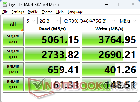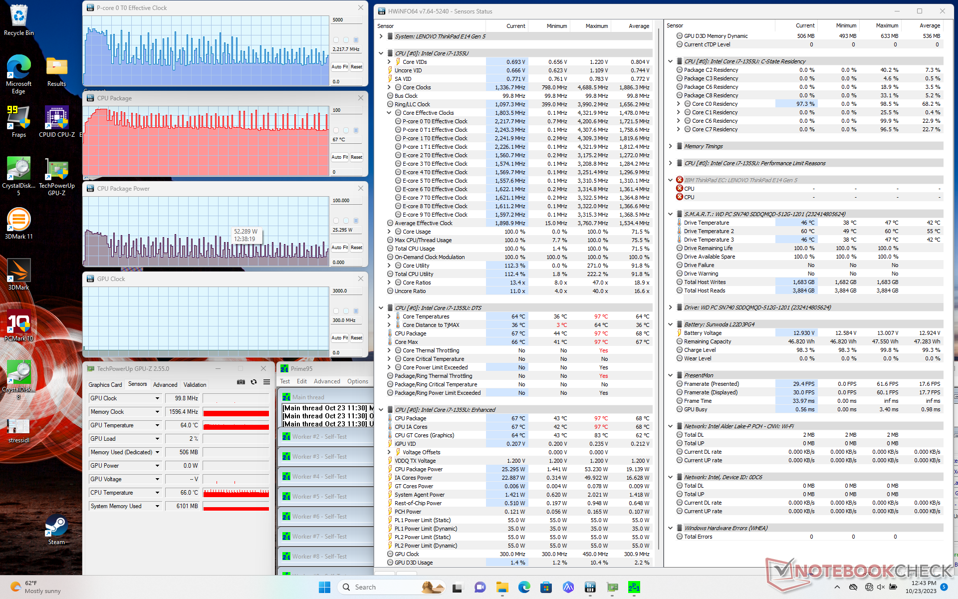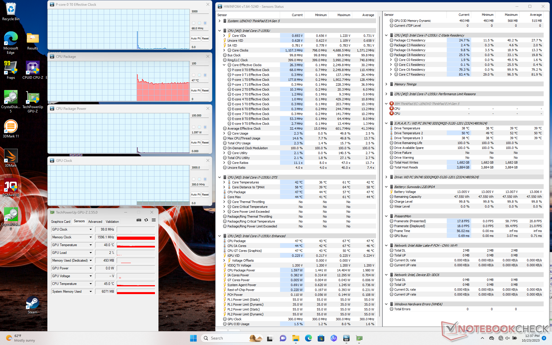 Im Vergleich zum Ryzen 7 7730U im AMD-basierten ThinkPad E14 G5 bietet unser Core i7-1355U eine 25 bis 30 Prozent schnellere Single-Thread-Leistung, aber eine 25 bis 30 Prozent langsamere Multi-Thread-Leistung, sobald die Drosselung berücksichtigt wird.