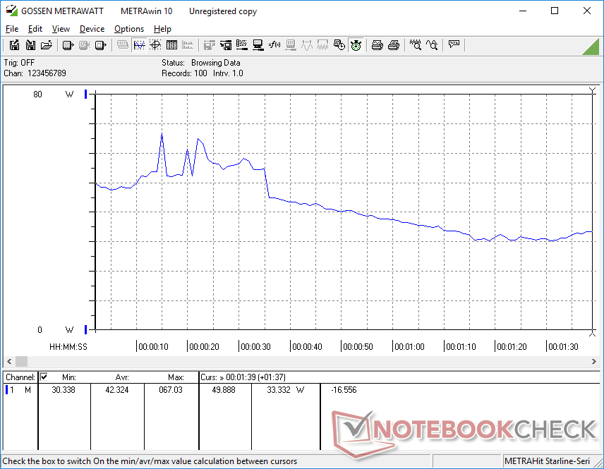 Das kleine (9 x 4,7 x 2,7 cm) 65-W-USB-C-Netzteil kann bis zu 67 W liefern, wenn die CPU zu 100 Prozent ausgelastet ist. Das Intel-System ist also stromhungriger als das AMD-System, wenn der Turbo Boost am schnellsten läuft, zum Beispiel beim Multitasking oder beim Starten von Anwendungen. Dies ist auch beim Starten des CineBench R15 xT Benchmarks zu beobachten, wie die untenstehende Vergleichsgrafik zeigt. Ansonsten ist der Verbrauch zwischen den beiden Versionen im Leerlauf auf dem Desktop oder bei weniger anspruchsvoller Last in etwa gleich.