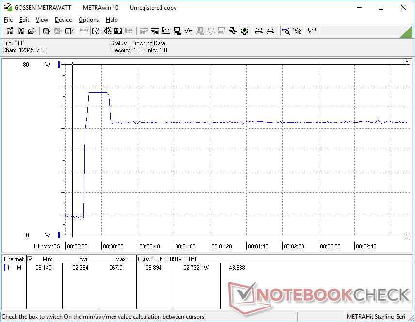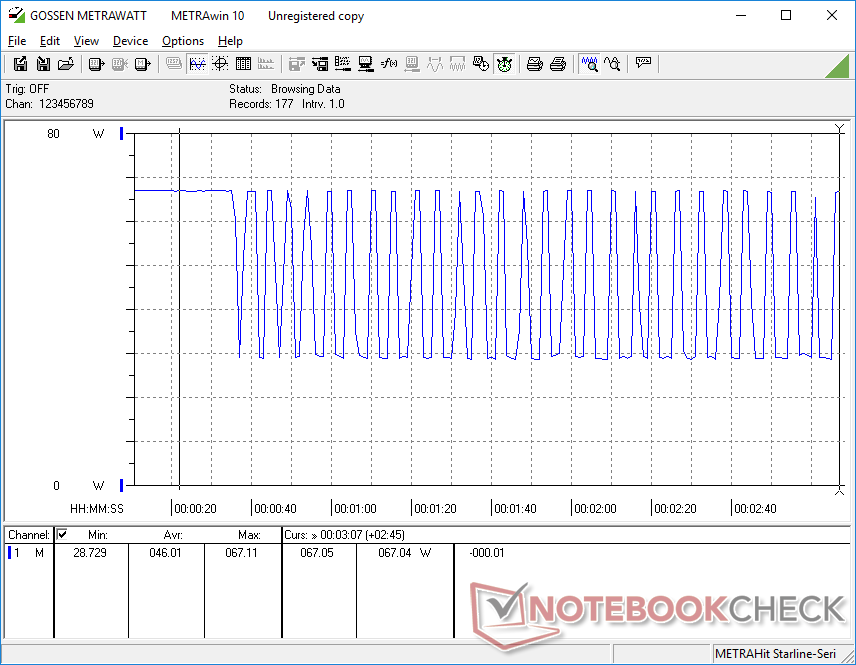 Das Verhalten des Energieverbrauchs spiegelt das oben erwähnte steile CPU-Drosselungsverhalten wider. Bei der Ausführung von Prime95 schwankt der Verbrauch beispielsweise zwischen 29 W und 67 W, während derselbe Test auf dem AMD ThinkPad E14 G5 eine konstantere Leistung von 47 W ergibt.