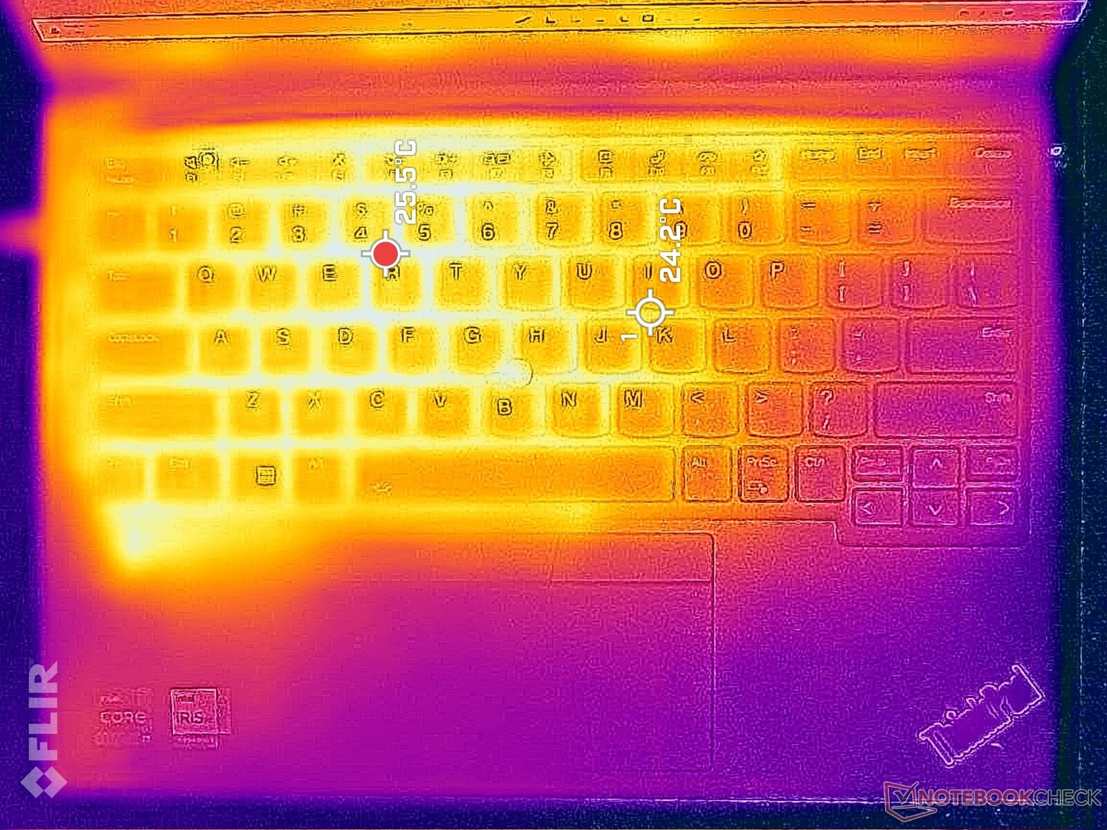 (+) Die Handballen und der Touchpad-Bereich sind mit gemessenen 29.8 °C kühler als die typische Hauttemperatur und fühlen sich dadurch kühl an.