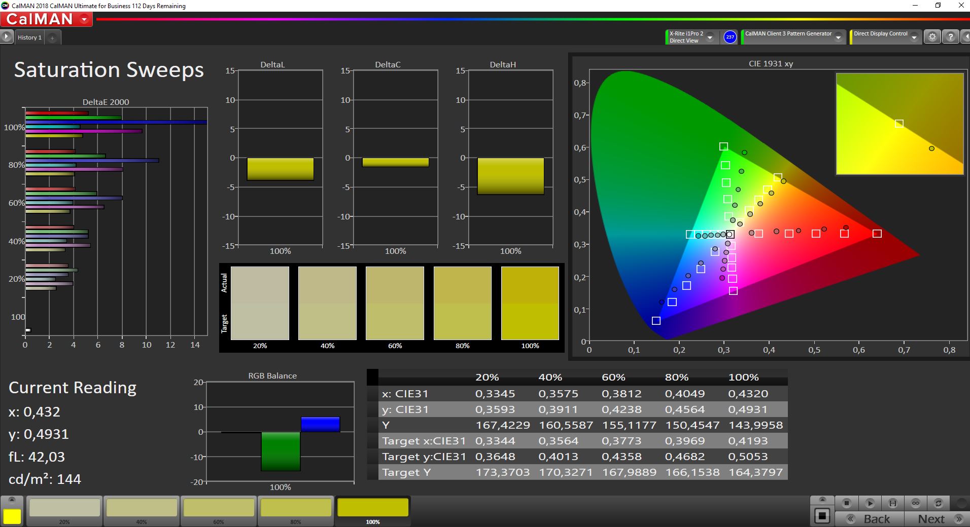 Wir haben das Panel mit der professionellen CalMAN-Software und dem X-Rite i1 Pro 2 vermessen/kalibriert. Vorneweg muss man direkt sagen, dass es sich um ein ziemlich günstiges IPS-Panel handelt, da die Farbabweichungen sehr hoch sind und selbst der kleine sRGB-Farbraum nur zu 60% abgedeckt wird. Die Graustufen-Darstellung ist jedoch schon ab Werk sehr gut und es gibt vor allem auch keinen Farbstich. Mit unserer Kalibrierung können wir die Werte zwar noch etwas verbessern, doch das sieht man mit dem bloßen Auge nicht.