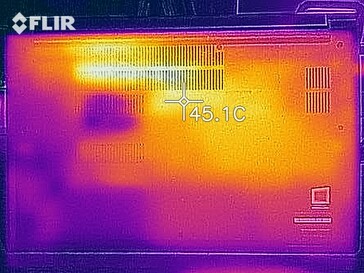 (-) Auf der Unterseite messen wir eine maximalen Wert von 47 °C (im Vergleich zum Durchschnitt von 36.8 °C).