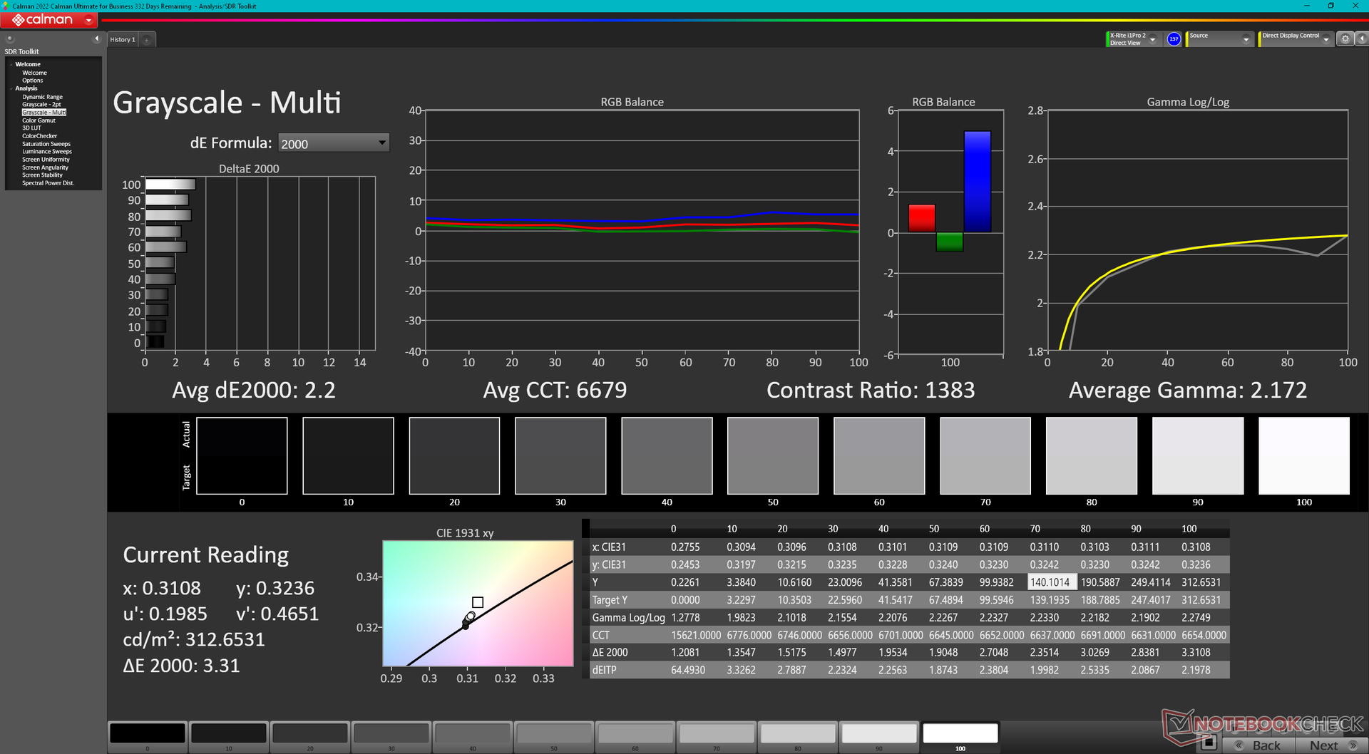 Die Kalibrierung des Bildschirms mit einem X-Rite Kolorimeter würde die durchschnittlichen Graustufen- und Farb-DeltaE-Werte leicht von 3,2 und 3,73 auf 2,2 bzw. 2,03 verbessern. Allerdings werden die Farben bei höheren Sättigungswerten aufgrund der oben erwähnten engen sRGB-Farbabdeckung immer noch zunehmend ungenau.