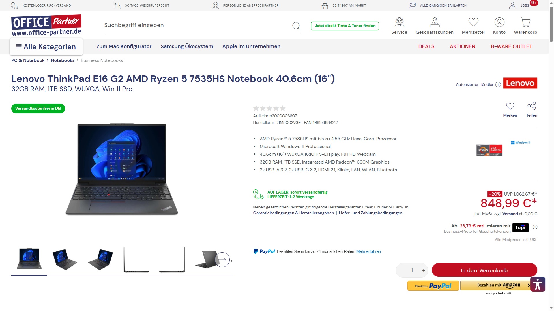 Die ThinkPad-E-Reihe stellt den Einstieg in die Welt der ThinkPad-Notebooks dar: Die Geräte sind preislich im Mittelfeld angeordnet. Aktuell führt Office-Partner.de mit dem ThinkPad E16 G2 21M50001GE ein AMD-basiertes 16-Zoll-Modell der Reihe zu einem Angebotspreis von 848,99 Euro im Sortiment. Ein Kauf via eBay.de wäre dank eines Rabattcodes (POWEREBAY3) bereits für 843,80 Euro möglich. Ein Schwestermodell ergatterte in unserem Test die Bewertung „Gut (84 %)“.