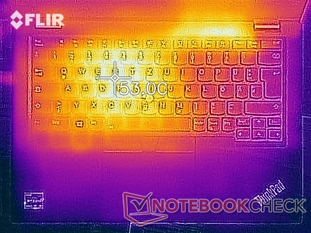 Die generelle Erwärmung des Geräts hält sich sehr zurück. Oben mittig im Bereich der Tastatur ist eine leichte, quasi angenehme Erwärmung zu spüren. Der Rest des Laptops blieb vollkommen kühl, bis auf den Bereich des Lüftungseinlasses auf der Unterseite samt Lüftungsauslass an der Hinterseite des Geräts. Zu heiß wurde es aber auch hier nicht, da die Leistung vorher gedrosselt wird.