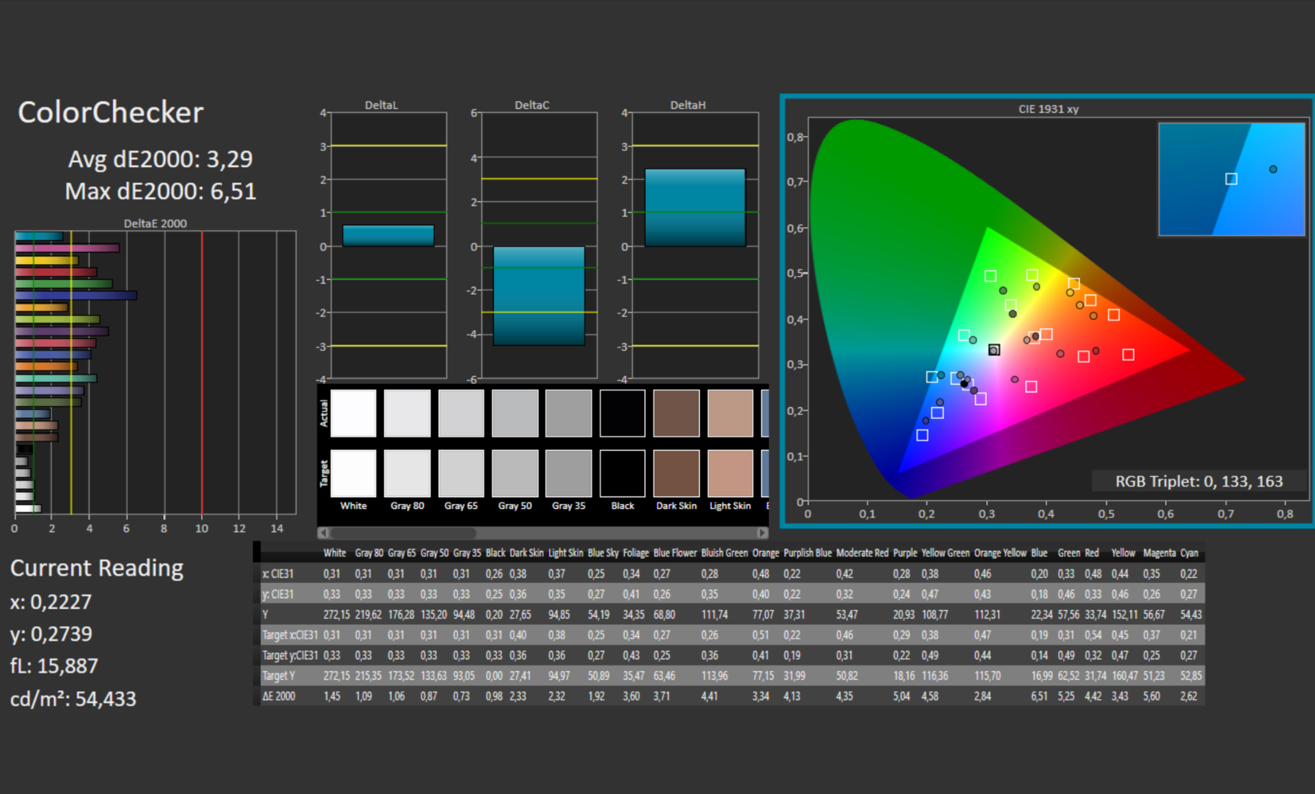| Colorchecker dE 2000 max. * | 6.22 | 17.7 -185% | 3.8 39% | 6.83 -10% | 3 52% | 4.35 30% |