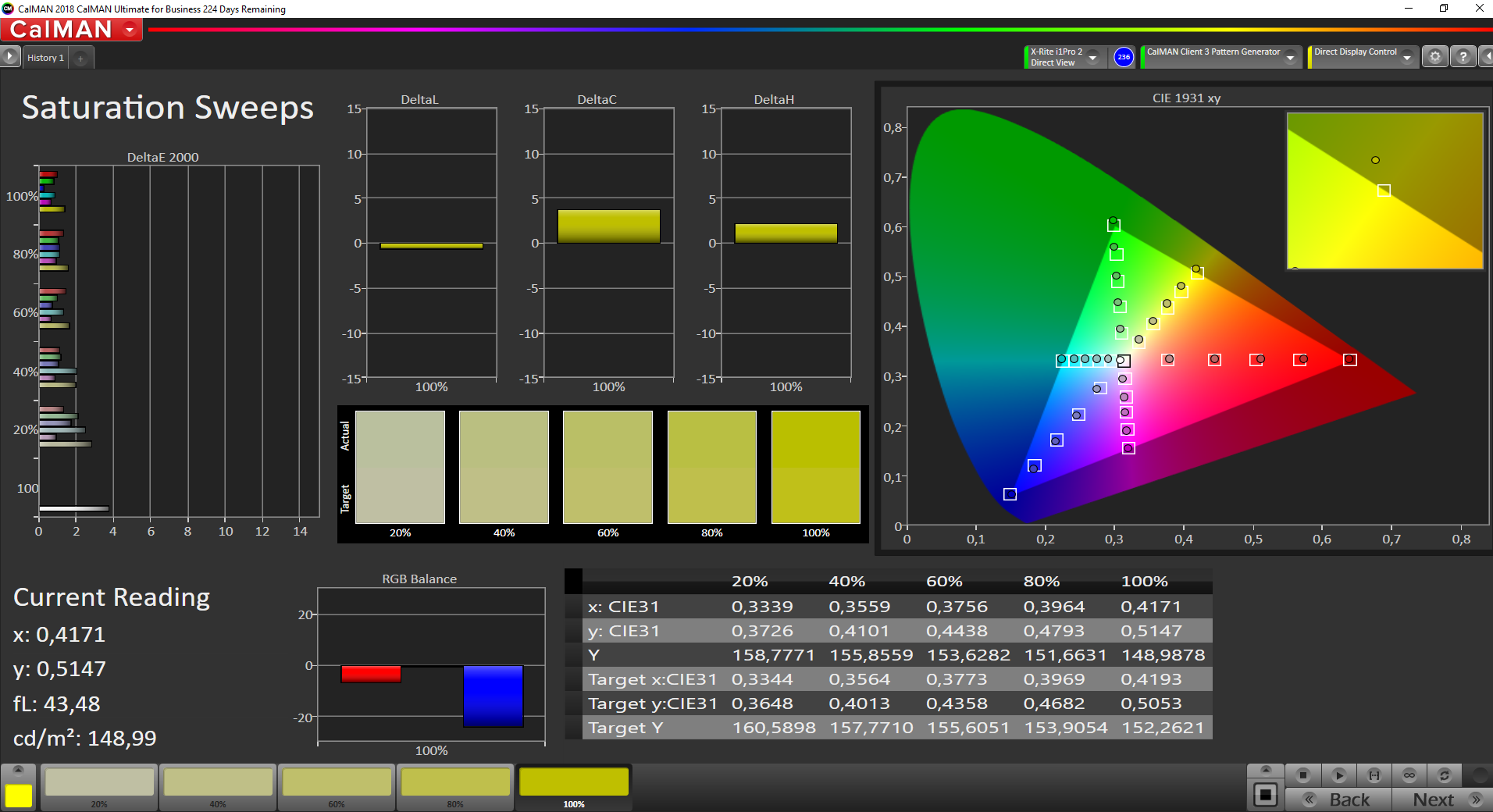 Für die Analyse des Displays nutzen wir die professionelle CalMAN-Software und das X-Rite i1 Pro 2 Spektralfotometer. Ab Werk ist das Panel bereits ordentlich kalibriert, denn die Abweichungen bei den Graustufen und auch den Farben gegenüber der sRGB-Referenz liegen bereits unter der wichtigen Marke von 3. Es gibt zwar einen minimalen Farbstich in Richtung Grün, doch den sieht man nur im direkten Vergleich mit einem kalibrierten Bildschirm.