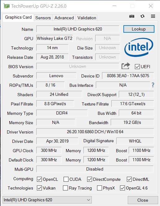 | 83.2 % v7 (old) | 10 / 2019 | Lenovo ThinkPad L590-20Q70019GE i5-8265U, UHD Graphics 620 | 2 kg | 23 mm | 15.60" | 1920x1080 | |