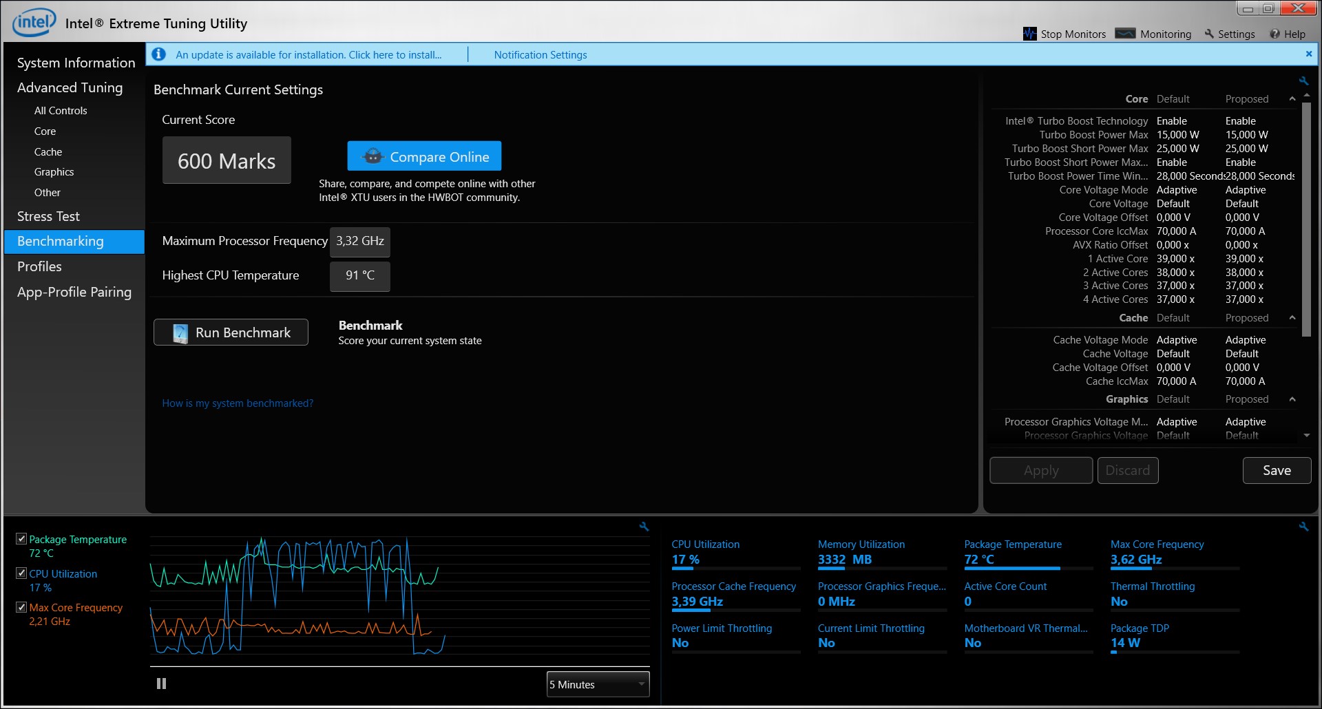 Beim Stresstest erhitzte sich der SoC auf maximal 75 °C. Mit 15 Watt pendelt sich der Verbrauch des SoC im Verlauf ein. Dabei liegt der Prozessor mit durchschnittlich 2 GHz durchweg über dem Basistakt (1,6 GHz). Einen nachhaltigen Einfluss hatte diese Dauerbelastung auf die 3D-Performance nicht.