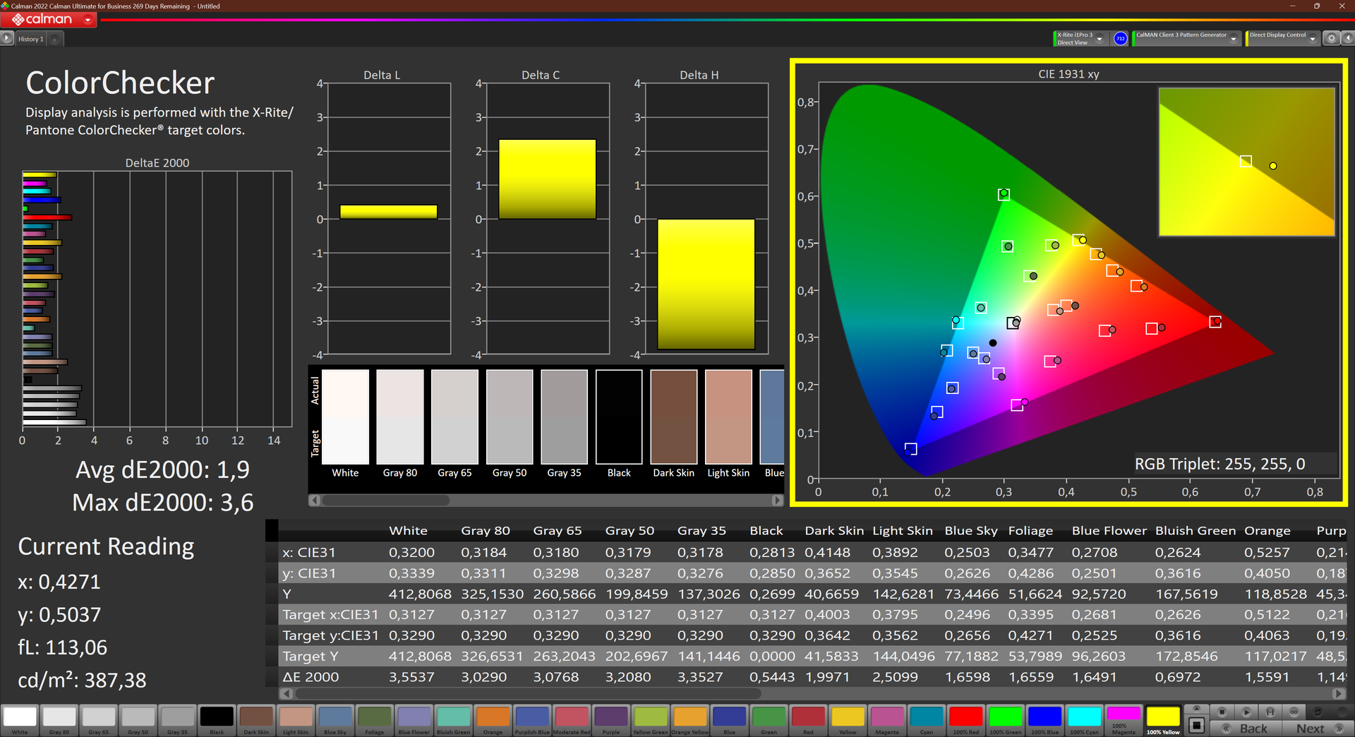| Colorchecker dE 2000 max. * | 3.6 | 4.4 -22% | 3.1 14% | 7.81 -117% | 3.7 -3% | 18.3 -408% | 4.07 -13% |