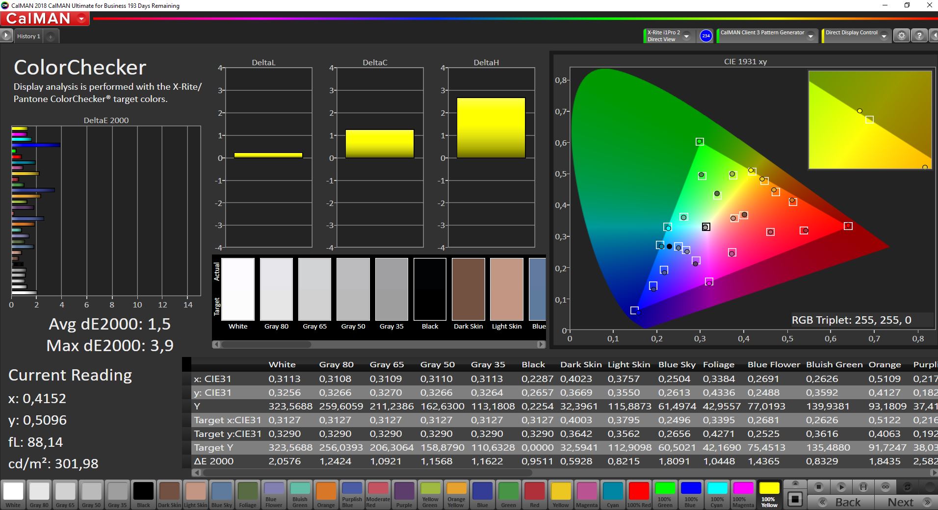 Die CalMAN-Analyse zeigt außerdem, dass der Bildschirm Farben ab Werk mit einem zu hohen Blauanteil und einer DeltaE2000-Abweichung von 5,3 anzeigt. Durch eine Kalibrierung lässt sich dieser Umstand ausgleichen und der DeltaE2000-Wert auf 1,2 senken. Die entsprechenden ICC-Datei kann im Fenster oben rechts neben der Grafik zur Ausleuchtung des Bildschirms heruntergeladen werden.