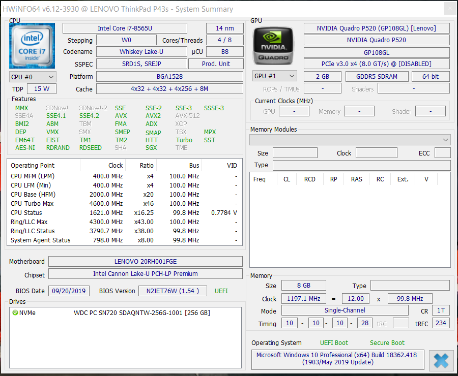 | 80.1 % v7 (old) | 10 / 2019 | Lenovo ThinkPad P43s-20RH001FGE i7-8565U, Quadro P520 | 1.5 kg | 18.9 mm | 14.00" | 1920x1080 | |