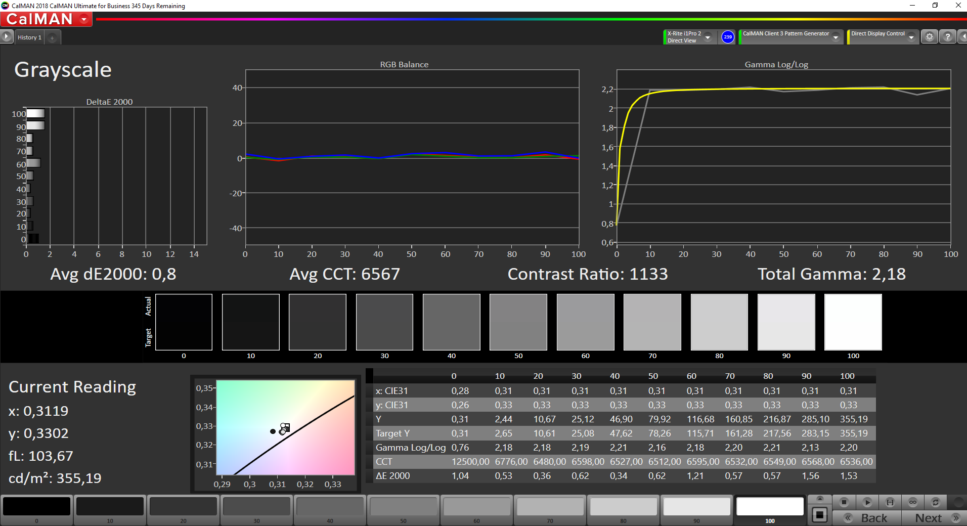 | Delta E Graustufen * | 5.5 | 3.83 30% | 0.8 85% | 3 45% | 5.1 7% |