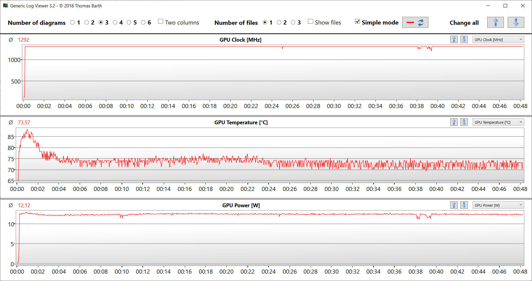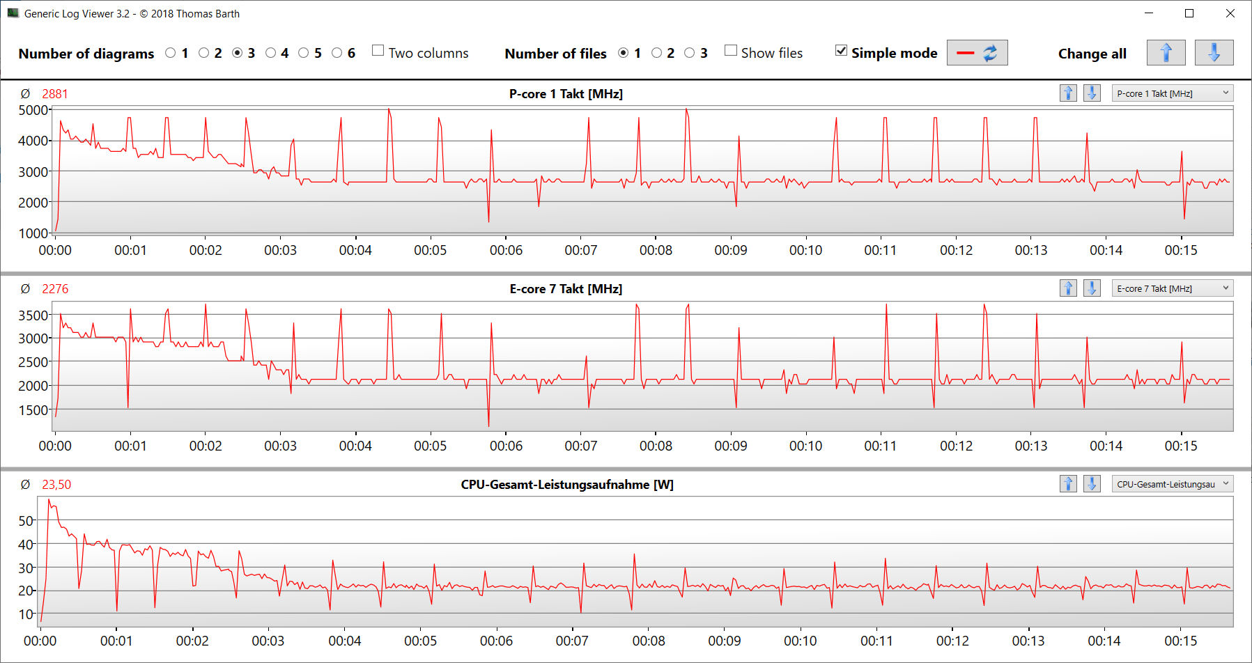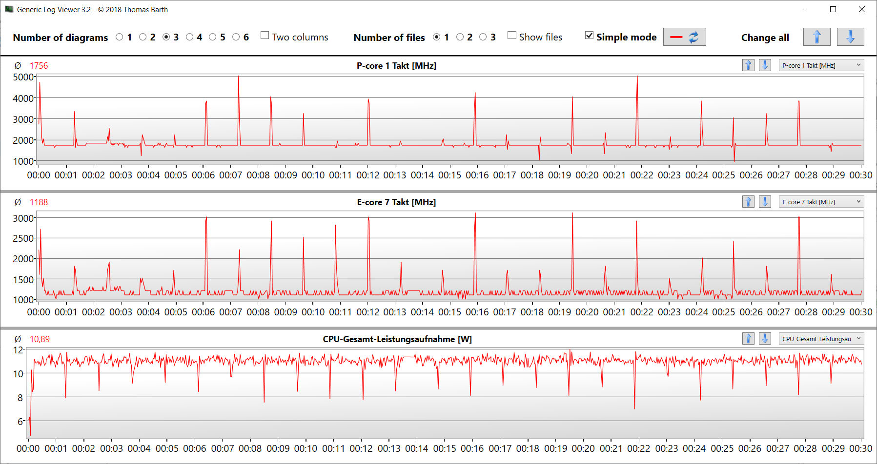 Der Stresstest (Prime95 und Furmark im Dauerbetrieb) stellt ein Extremszenario zur Überprüfung der Systemstabilität unter Volllast dar. CPU (P: 3,2 GHz; E: 2,5 bis 2,6 GHz) und GPU (1.300 MHz) arbeiten zu Beginn des Tests mit recht hohen Taktraten. Im weiteren Verlauf sinken die Werte.