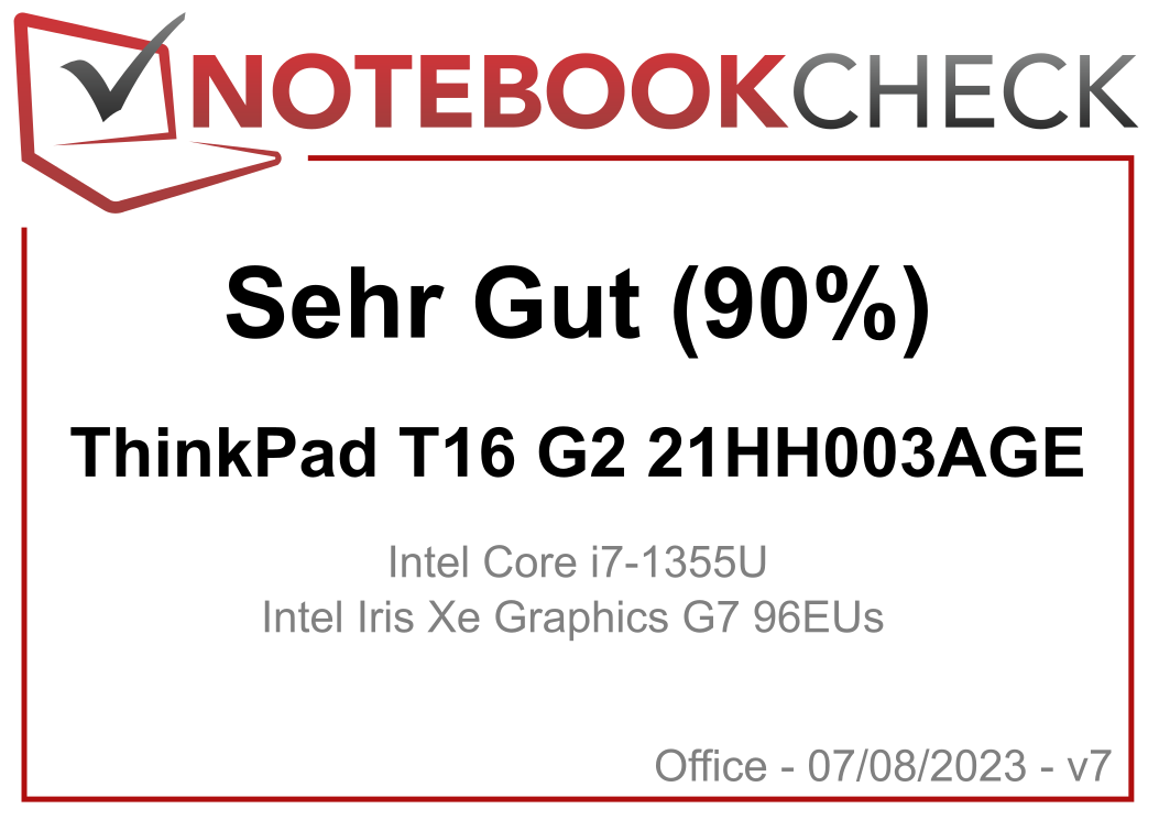 | 90 % v7 (old) | 08 / 2023 | Lenovo ThinkPad T16 G2 21HH003AGE i7-1355U, Iris Xe G7 96EUs | 1.8 kg | 20.5 mm | 16.00" | 1920x1200 | |