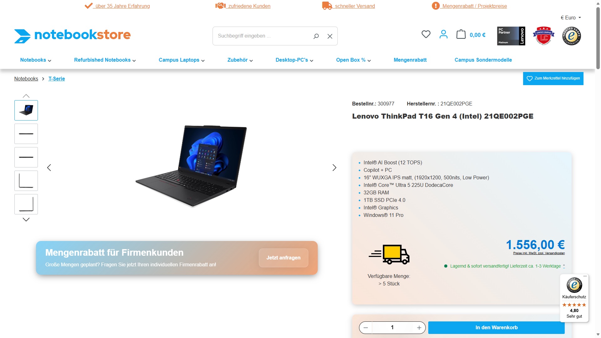 Die ThinkPad-T-Reihe der Firma Lenovo steht für Business-Notebooks der Oberklasse. Aktuell führt Notebookstore.de mit dem ThinkPad T16 G4 21QE002PGE ein gut ausgestattetes 16-Zoll-Modell der Serie zu einem Preis von 1.556 Euro im Sortiment. Ein AMD-basiertes Schwestermodell ergatterte in unserem Test die Wertung „Gut (87 %).