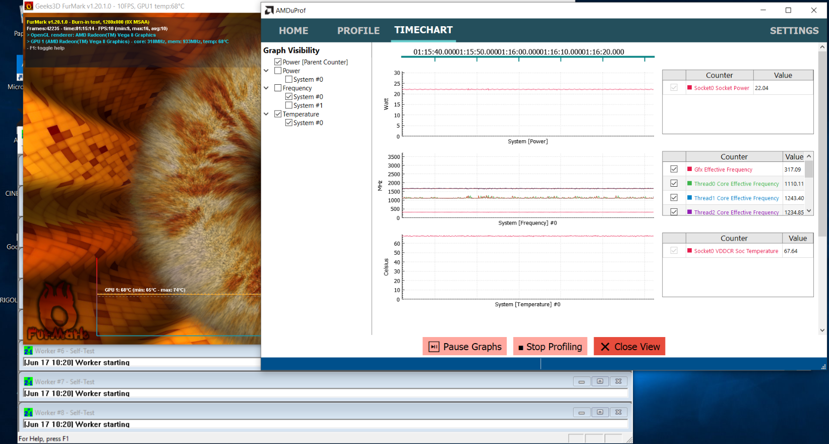 Der Stresstest spiegelt unsere Ergebnisse aus den Prozessorbenchmarks wider, denn nach der Begrenzung auf 25 Watt fällt der SoC-Verbrauch dann auf 22 Watt und bleibt stabil. Da sich CPU & GPU diesen Wert teilen müssen, fallen die Takte natürlich geringer aus. Der Prozessor arbeitet nur noch mit 1,1-1,3 GHz, die Grafikkarte mit rund 320 MHz.