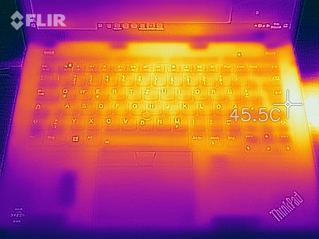 Die Temperaturentwicklung des ThinkPad T495 ist nicht kritisch. Im Leerlauf gibt es sowieso keine Probleme und unter Last messen wir nur an zwei Punkten eine Temperatur von mehr als 47 °C. Auf dem Schoß sollte man das Gerät in langen Lastphasen also nicht verwenden, doch ansonsten gibt es keine Einschränkungen. Beim direkten Vergleich mit dem ThinkPad T490 wird das AMD basierte T495 ein wenig wärmer als das T490 mit der iGPU, aber deutlich kühler als das T490 mit der dedizierten GeForce MX250.