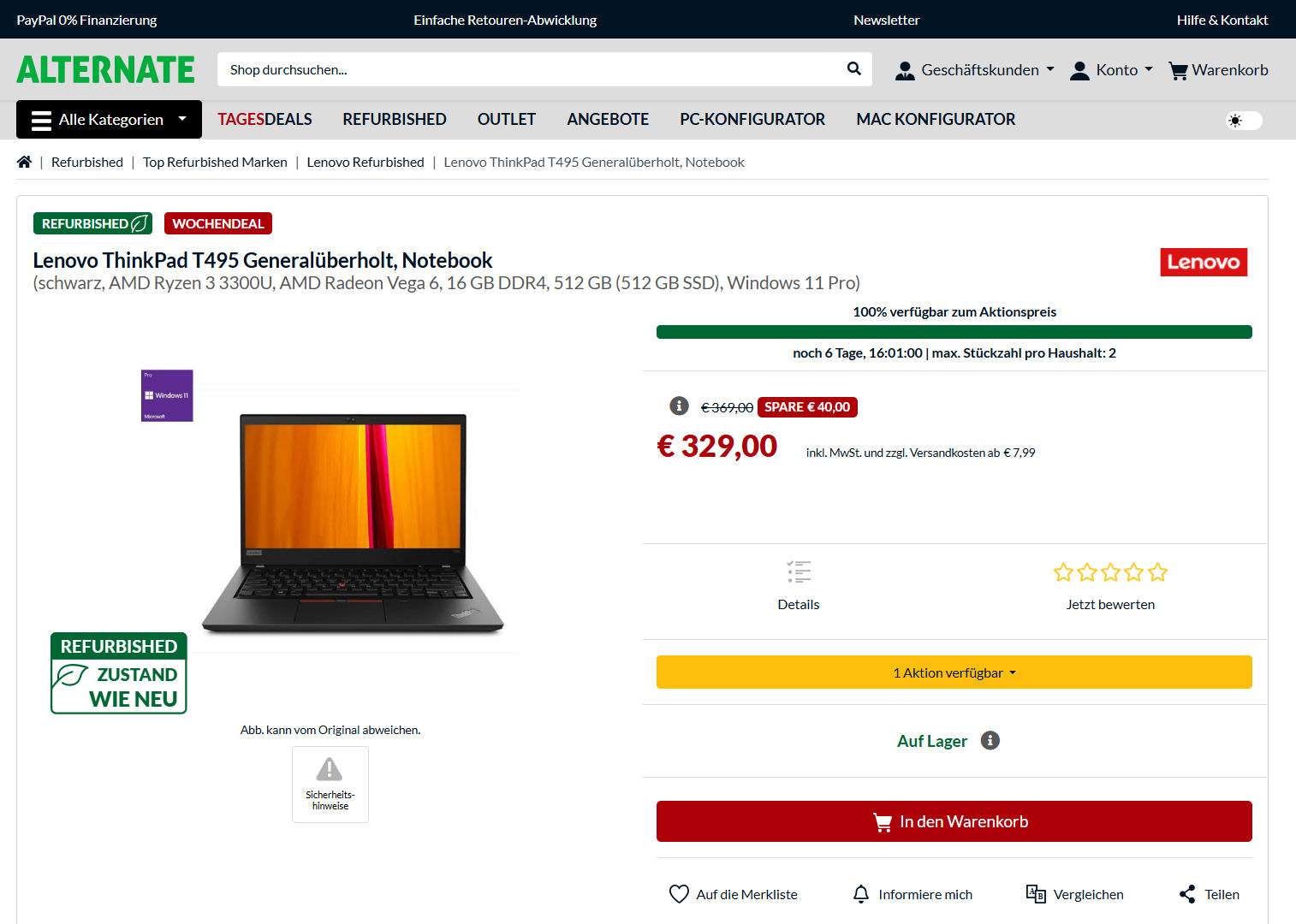 Die ThinkPad-T-Reihe der Firma Lenovo steht für Business-Laptops der Oberklasse. Lenovo setzt dabei sowohl auf AMD APUs als auch auf Prozessoren von Intel. Aktuell führt Alternate.de mit dem ThinkPad T495 ein AMD-basiertes Modell zu einem Preis von 329 Euro im Sortiment. Es handelt sich hierbei um Gebrauchtware. Der Zustand wird seitens Alternate als „Wie neu“ bezeichnet. Das ThinkPad ist uns bekannt: Eine leistungsstärkere Variante des Rechners musste sich im Jahre 2019 unserem Test stellen.