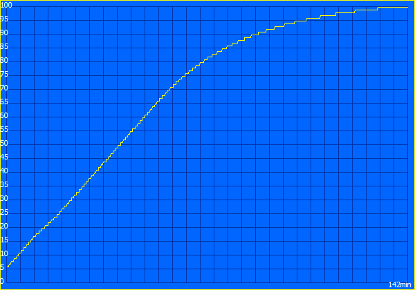 Der maximale Verbrauch beträgt 69,4 Watt, er liegt damit oberhalb der Kapazität des 65-Watt-Netzteils. Allerdings sinkt der Verbrauch nach etwa drei Minuten unter Last auf etwa 64 Watt und schließlich auf nur 54 Watt. Durchschnittlich beträgt der Verbrauch unter Last 61,6 Watt, was kein Problem für das Netzteil darstellt.