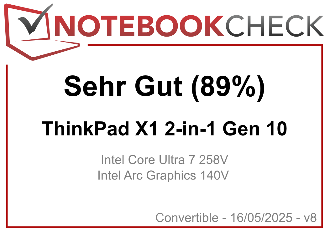 | Lenovo ThinkPad X1 2-in-1 Gen 10 Intel Core Ultra 7 258V ⎘ Intel Arc Graphics 140V ⎘ 32 GB RAM | Amazon: Bestpreis 2520€ MetaComp 2. 2524€ notebookstore 3. 2530€ lapstars | 1.4 kg | 18.3 mm | 14.00" 1920x1200 162 PPI IPS | |