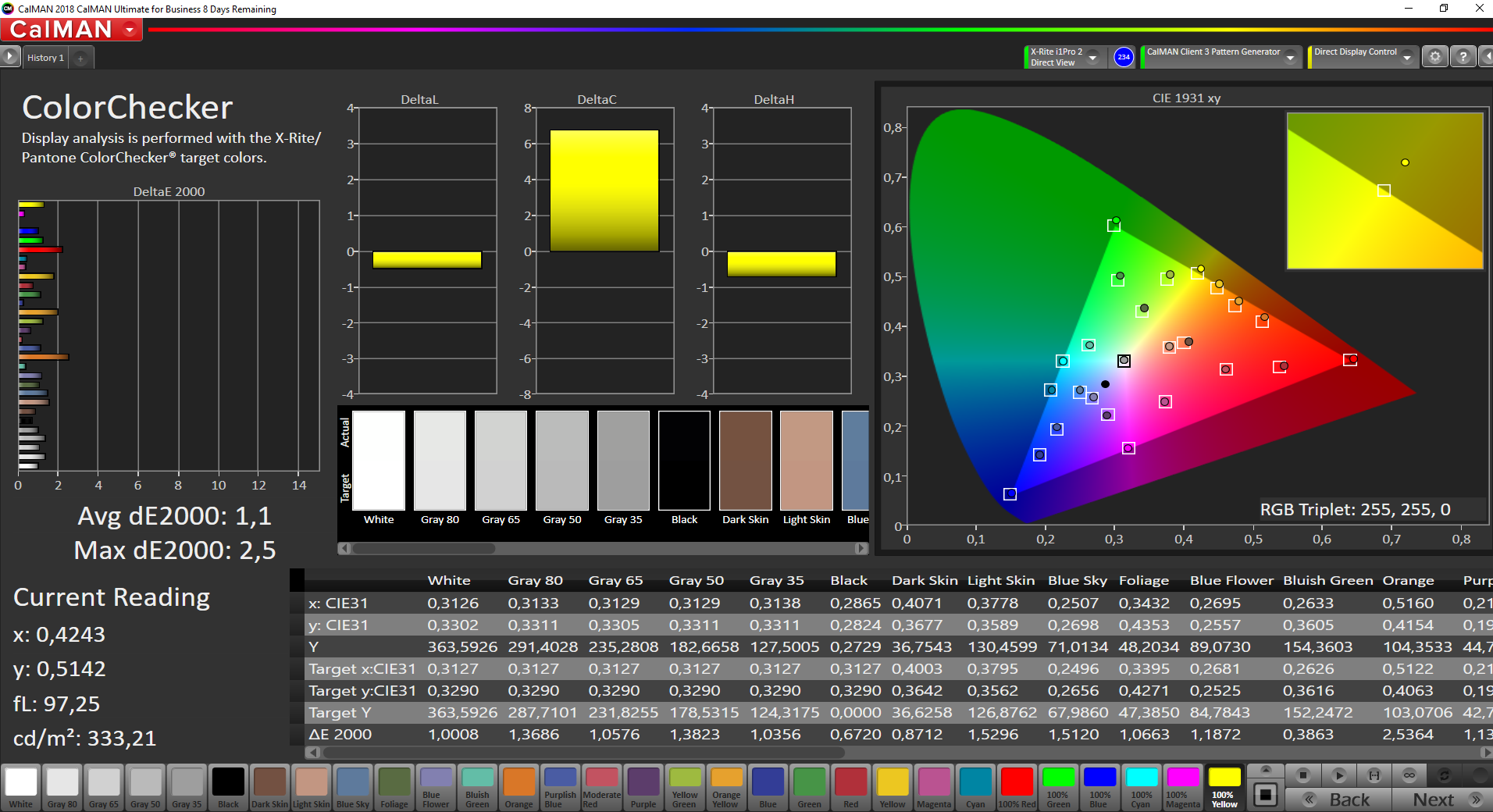 Wie viel Potenzial in dem Panel von Innolux steckt, wird nach unserer Kalibrierung sichtbar. Das entsprechende Profil ist wie immer oben in der Box verlinkt und steht zum kostenlosen Download zur Verfügung. Die Abweichungen bei den Graustufen und auch den Farben liegen nun alle unterhalb der wichtigen Grenze von 3, und auch der Farbstich gehört der Vergangenheit an. Zusammen mit der fast vollständigen sRGB-Abdeckung (98,6 %; AdobeRGB: 63,4 %) eignet sich das Panel daher auch für die Bildbearbeitung.