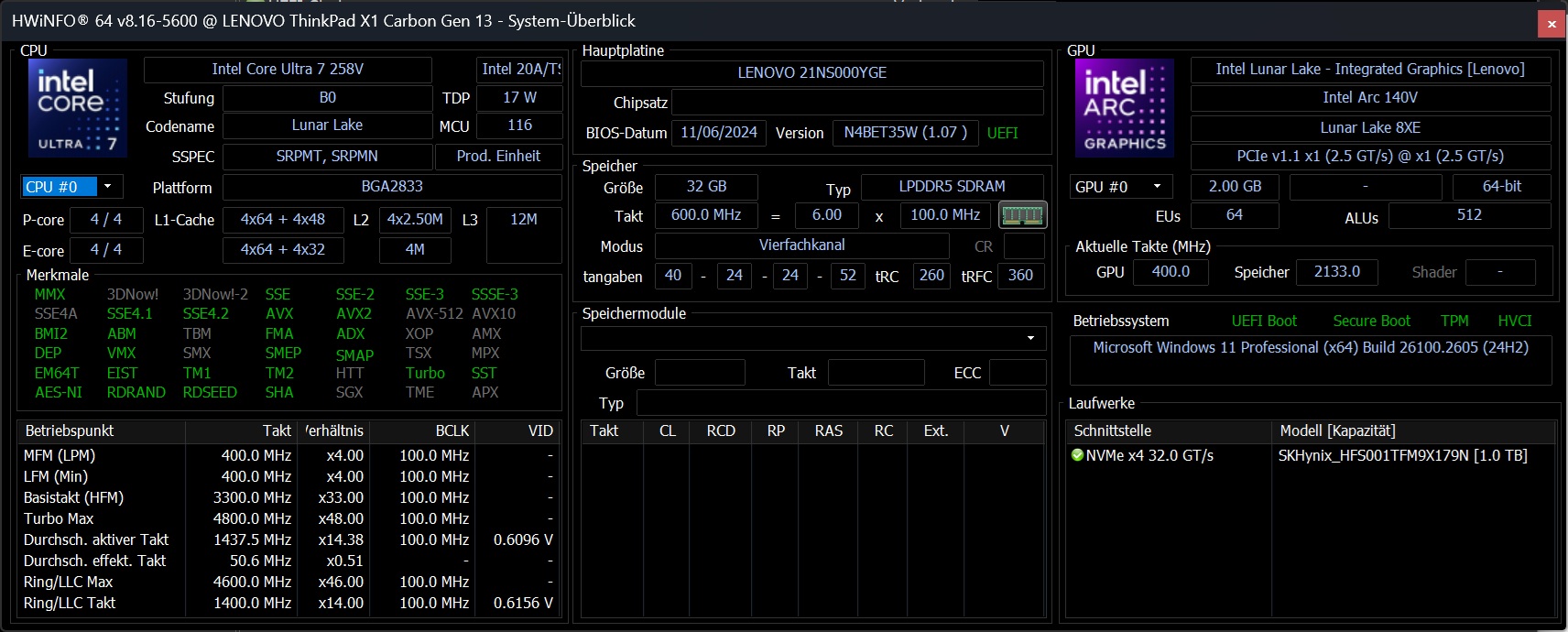 Das neueste Modell verfügt über alle guten Qualitäten des letztjährigen X1 Carbon Gen 12 und baut diese teilweise noch aus, zum Beispiel mit einem merklich reduzierten Gewicht. Noch wichtiger ist, dass das neue X1 Carbon G13 alle kritischen Schwächen des Vorgängers behebt: Es läuft wesentlich weniger heiß und ist deutlich langlebiger. Die Akkulaufzeit fällt rund 30 Prozent besser aus - endlich hat auch das Modell mit OLED-Display eine brauchbare Laufzeit. Einzig die niedrig-aufgelöste FHD-Webcam sticht negativ hervor. Zudem gibt es anders als beim Vorgänger keine Option für 64 GB RAM, was aber ein Lunar Lake Limit ist.