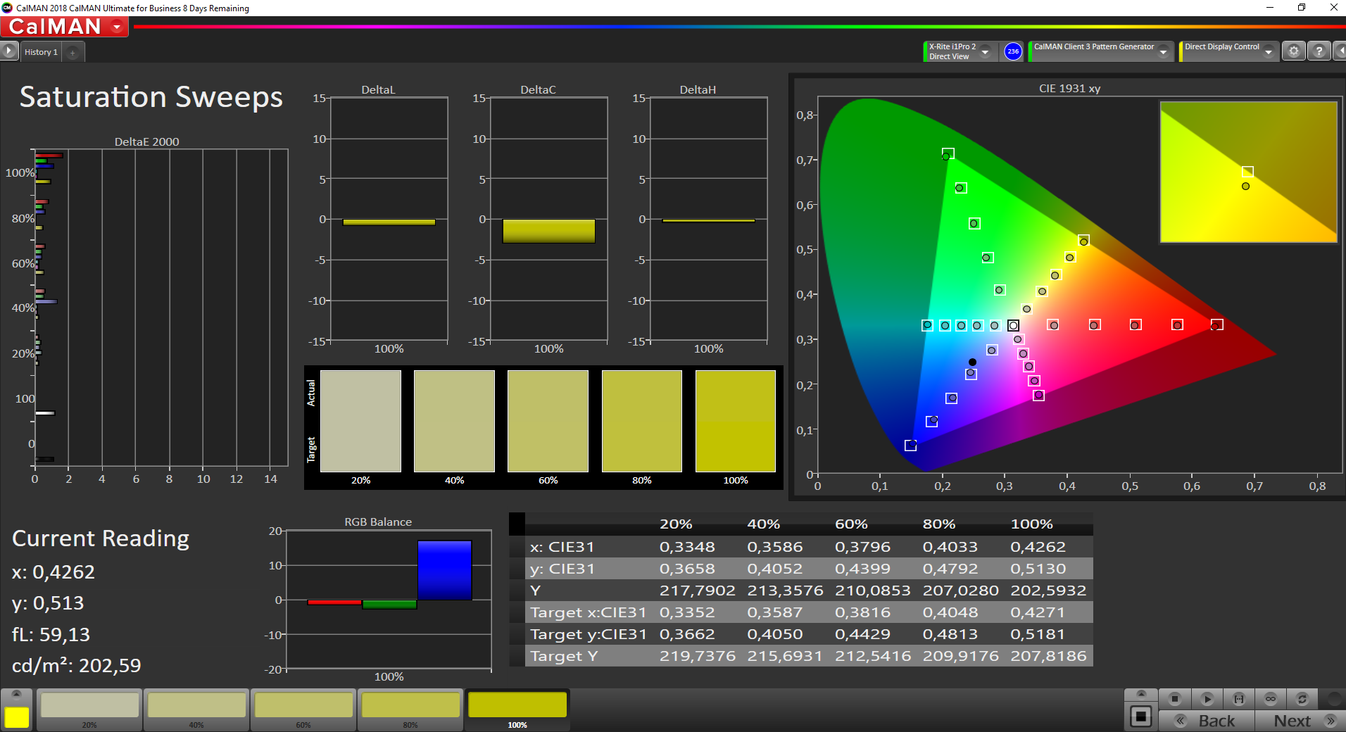 Wir verwenden für die Displaymessungen die professionelle CalMAN-Software in Verbindung mit dem X-Rite i1 Pro 2 Spektralfotometer. Den leichten Rotstich hatten wir ja schon so bemerkt und dieser wird in den Graustufen auch bestätigt. Wir sind aber insgesamt überrascht, denn die Kalibrierung ab Werk ist alles andere als gut. Sowohl bei den Graustufen als auch den Farben gibt es deutliche Abweichungen von den Zielwerten. Erst mit einer Kalibrierung von uns (das entsprechende Profil ist in der Box weiter oben verlinkt) kann man das volle Potenzial des Panels ausnutzen und die Ergebnisse können sich sehen lassen. Das matte 4K-Panel des X1 Extreme sollte man daher auf jeden Fall kalibrieren (lassen).