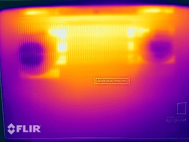 Im Alltag und bei einfachen Aufgaben hat das X1 Extreme G4 keine Temperaturprobleme. Beim Spielen und unter Last sollte man das Gerät allerdings nicht mehr auf den Oberschenkeln abstellen, da es auf der Unterseite Hotspots mit mehr als 50 °C gibt. Beim Spielen sind die Temperaturen sogar minimal höher, da die Lüfter hier etwas langsamer rotieren.