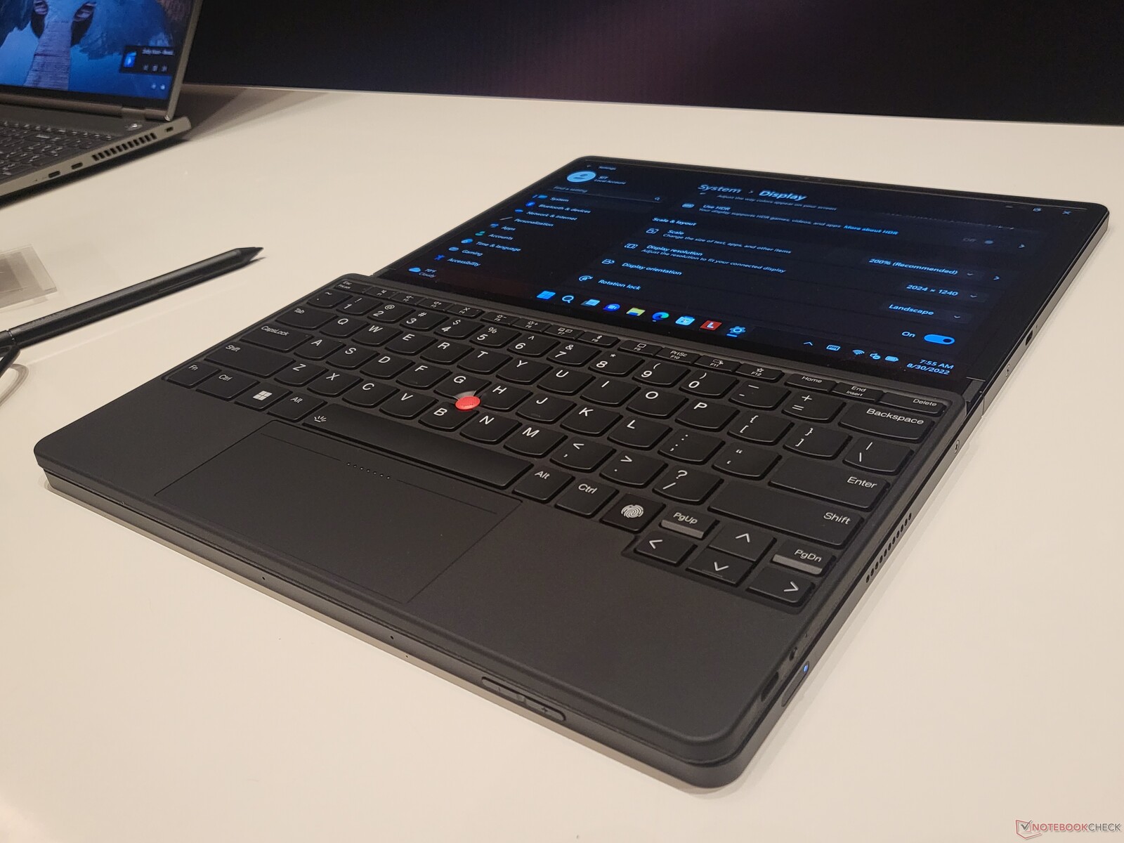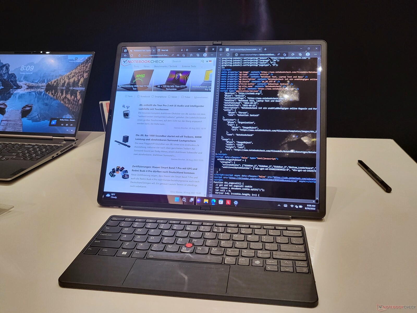 Eine große Design-Änderung bezieht sich auf das letzte Zubehörteil neben Stylus und Tastatur: Lenovo hat den Standfuß ausgelagert. Beim Vorgänger gab es noch einen integrierten Kickstand. Mit diesem ließ sich das Gerät nur horizontal hinstellen und Lenovo weist darauf hin, dass das X1 Fold mit dem neuen Standfuß auch vertikal ausgerichtet werden kann - für Programmierer und Texter ein sehr interessanter Use-Case. Und dennoch hat das einen großen Nachteil, denn mit dem Standfuß gibt es noch ein Zubehörteil, das mitgenommen werden muss und das Gewicht erhöht.