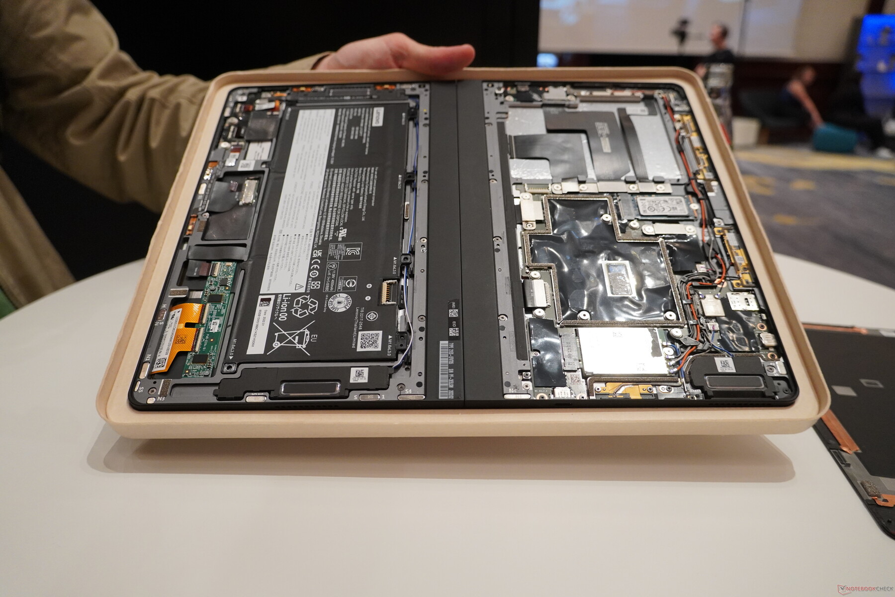 Während uns diese Änderung nicht zusagt, fanden wir es sehr schön, dass uns Lenovo einen Blick ins Innere des neuen X1 Folds gewährt hat. Dessen Aufbau ist relativ modular für so ein kompaktes Gerät, doch die Nutzer werden das X1 Fold 16 nicht aufrüsten können, denn die Rückseite ist verklebt. Immerhin ist die Wartung im Vergleich zum Vorgänger nun insoweit vereinfacht, dass Lenovo den ThinkPad-typischen Vor-Ort-Service anbieten kann. Das erste X1 Fold musste immer ins Service-Center geschickt werden.