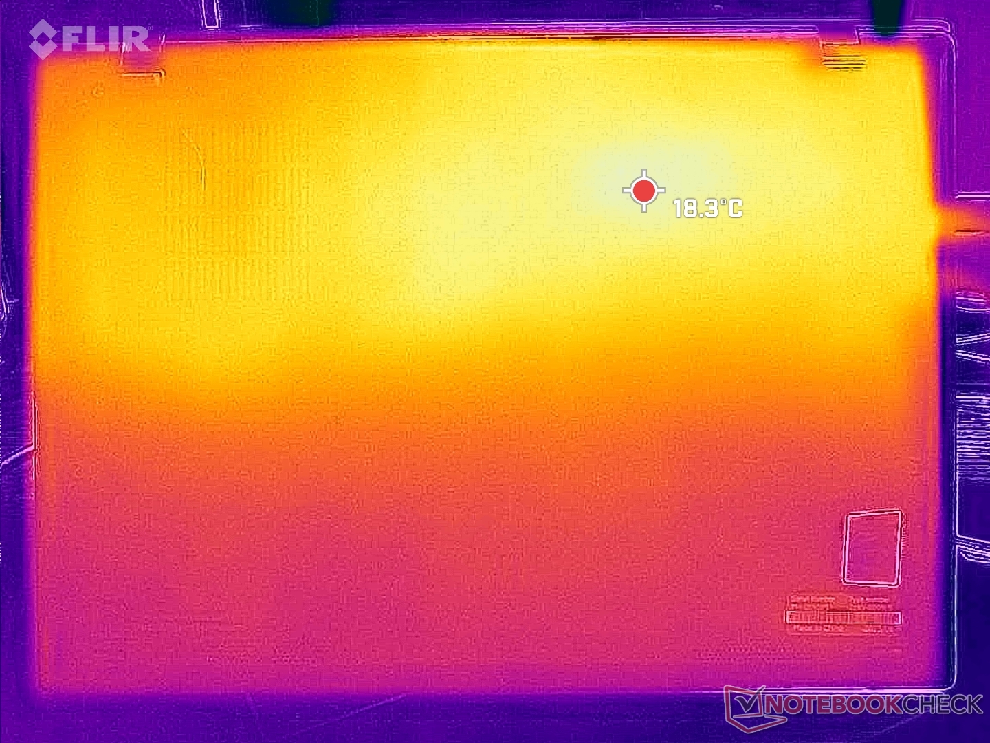 Die Oberflächentemperaturen sind höher als bei den meisten anderen Subnotebooks, da die Kühllösung für das ThinkPad X1 Nano so klein ist. Die Tastatur und die Unterseite können bis zu 38 bis 43 °C warm werden, was einige Grad wärmer ist als beim HP Dragonfly G4, wenn es ähnlich stark belastet wird.