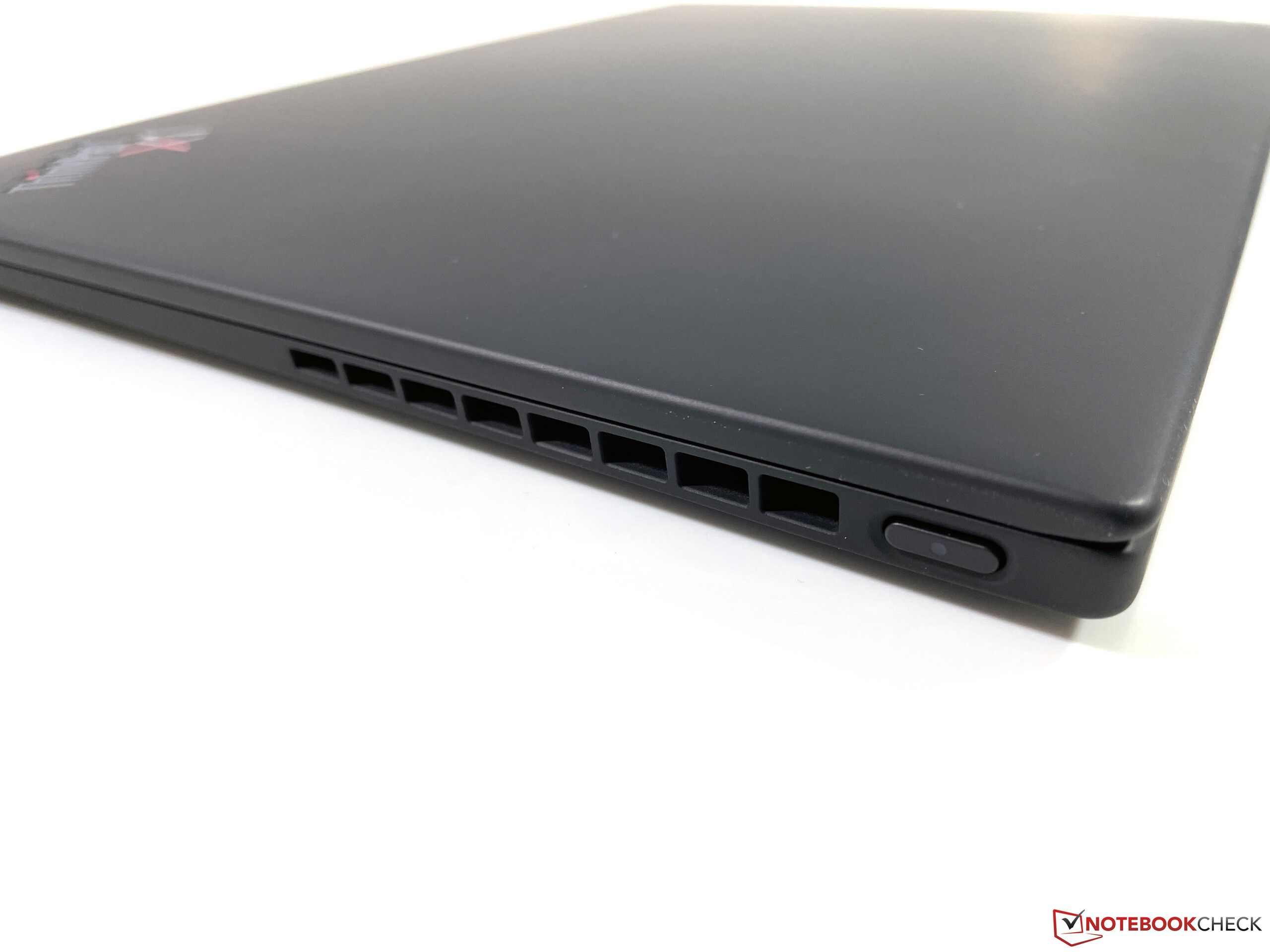 Damit ist man in der Praxis oftmals auf Adapter angewiesen, und einer der beiden USB-C-Ports ist in der Regel zudem durch das Netzteil blockiert. Auf der rechten Seite gibt es nur die Lüfteröffnungen und den Power-Button. Hätte man diesen auf der Oberseite der Baseunit positioniert (wie beim kommenden X1 Carbon G9), wäre sicherlich noch Platz für einen normalen USB-A-Stecker gewesen. Auf einen Steckplatz für ein Kensington Lock muss man ebenfalls verzichten.