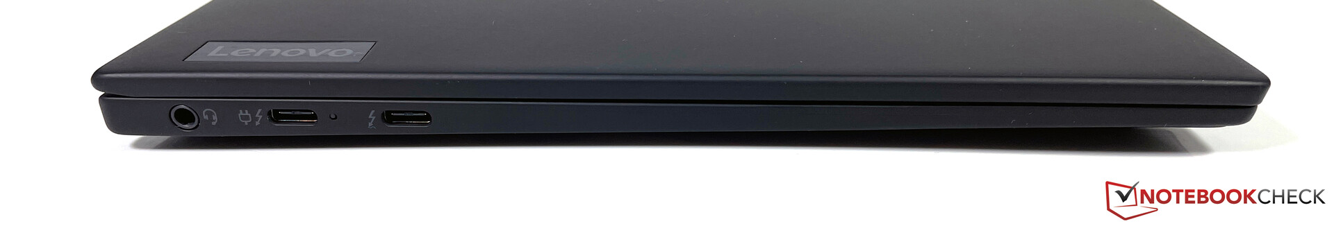 Die Anschlussvielfalt des X1 Nano ist im Vergleich zu anderen ThinkPads stark eingeschränkt. Es gibt nämlich nur eine 3,5-mm-Kopfhörerbuchse und zwei moderne USB-C-Stecker mit USB 4 und Thunderbolt 4, die beide zum Aufladen und auch zum Anschluss externer Monitore verwendet werden können (DisplayPort 1.4a, maximale Auflösung 5.120 x 3.200 bei 60 Hz). Insgesamt können drei verschiedene Displays angesteuert werden.