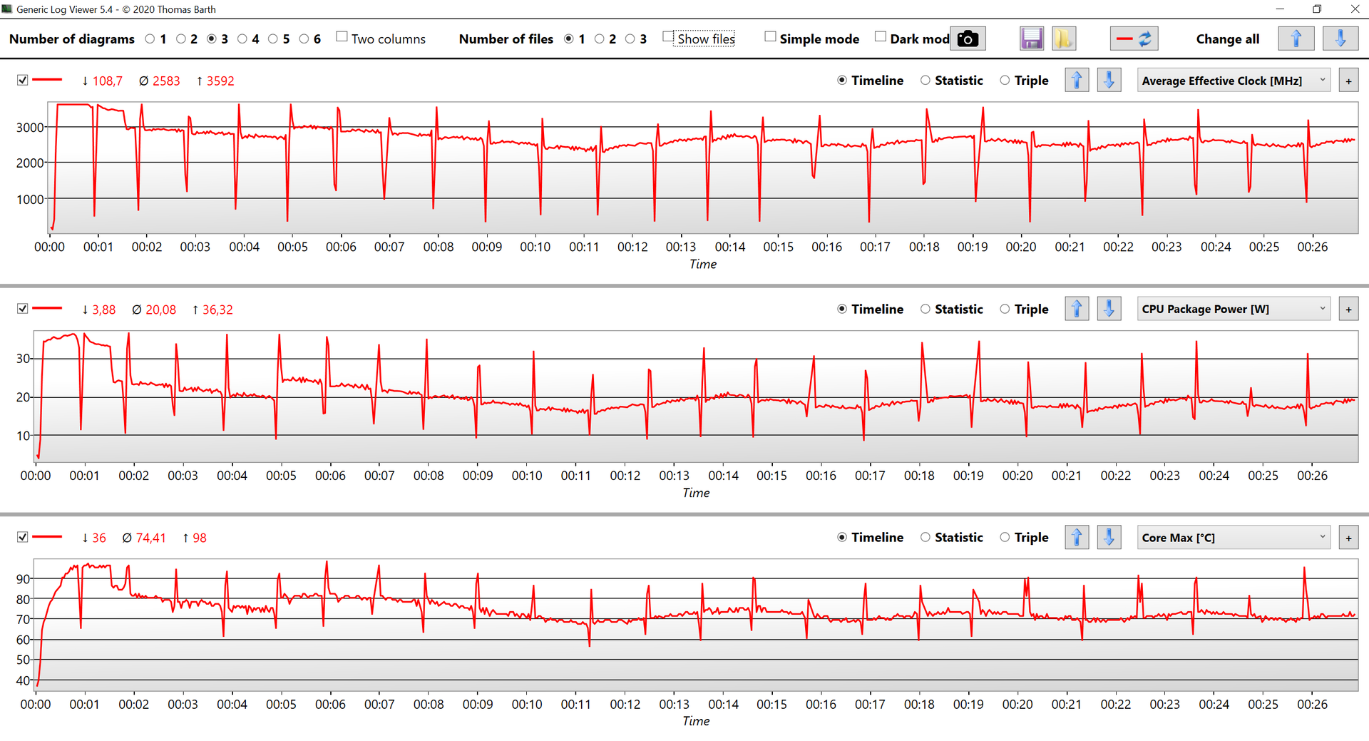 Während des Stresstests steigt der Stromverbrauch zu Beginn kurz auf 40 Watt, pendelt sich dann aber (analog zu reiner CPU-Last) bei etwa 19 Watt ein. Beide Komponenten bekommen in diesem Szenario ungefähr die gleiche Leistung zur Verfügung gestellt, was beim Prozessor für 4x 1,3 GHz und bei der iGPU für 700 MHz ausreicht. Direkt im Anschluss an den Stresstest gibt es keine Leistunsgreduzierung.