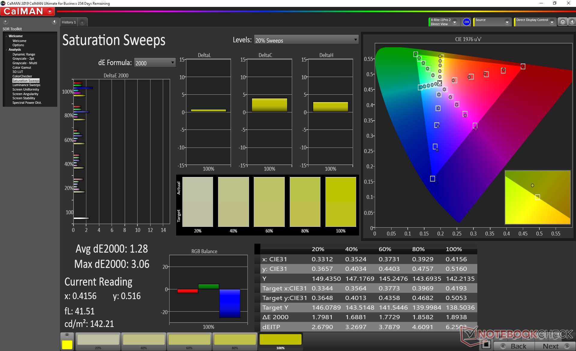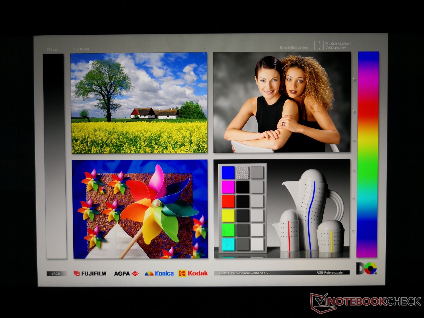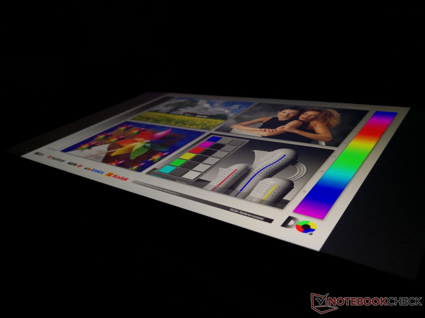 Weitere Messungen mit einem X-Rite-Farbspektrometer zeigen ein gut kalibriertes Display im Lieferzustand. Die DeltaE-Werte für Graustufen und Farben liegen bei 1,7 bzw. 2,07. Der Versuch, das Display noch mehr zu kalibrieren, bringt keine bemerkenswerte Verbesserung.
