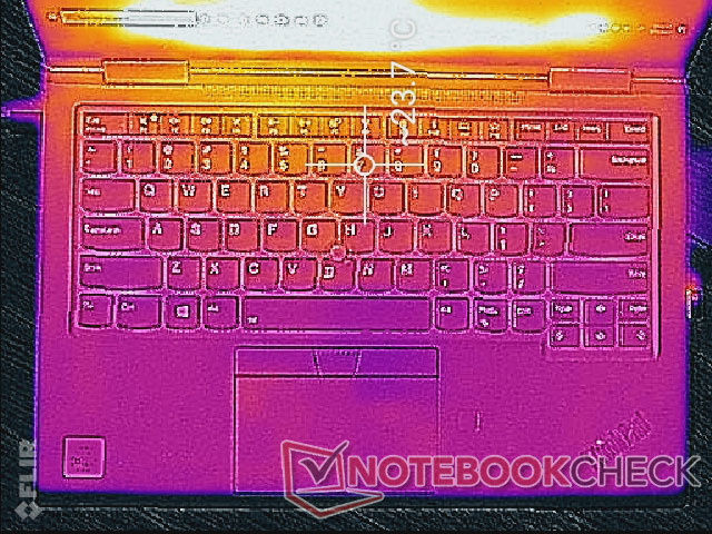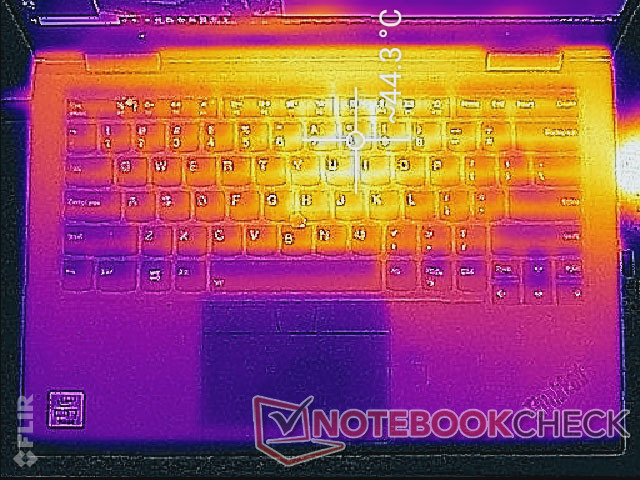Die Oberflächentemperaturen sind im Leerlauf gering, erreichen unter extremer Last an manchen Stellen aber bis zu 44 - 50 °C. Das ist immer noch geringer als was wir auf dem Dell Latitude 7400 2-in-1 gemessen haben, aber wärmer als das HP EliteBook x360 1040 bei ähnlicher Belastung. Möglicherweise hätten ein paar große Lüftungsschlitze auf der Unterseide die Oberflächentemperatur noch geringer gehalten. Das Convertible wird nie unangenehm warm, da sich die Hotspots nicht auf der Handballenablage, sondern im hinteren Bereich des Systems befinden.