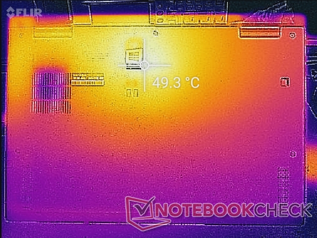 (-) Auf der Unterseite messen wir eine maximalen Wert von 49.4 °C (im Vergleich zum Durchschnitt von 36.8 °C).