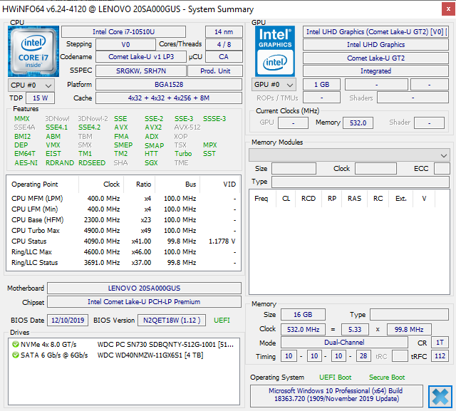 | Lenovo ThinkPad X1 Yoga 20SA000GUS UHD Graphics 620, i7-10510U, WDC PC SN730 SDBQNTY-512GB | HP Elitebook x360 1040 G5 UHD Graphics 620, i7-8650U, Samsung SSD PM981 MZVLB512HAJQ | Lenovo ThinkPad X1 Carbon G7 20R1-000YUS UHD Graphics 620, i7-10510U, WDC PC SN730 SDBPNTY-512G | Dell Latitude 7400 2-in-1 UHD Graphics 620, i7-8665U, Toshiba XG6 KXG60ZNV512G | Asus ZenBook Flip 14 UM462DA-AI023T Vega 10, R7 3700U | Lenovo ThinkPad X1 Yoga 2017 20JES03T00 HD Graphics 620, i7-7600U, Samsung SSD PM961 1TB M.2 PCIe 3.0 x4 NVMe (MZVLW1T0) | |