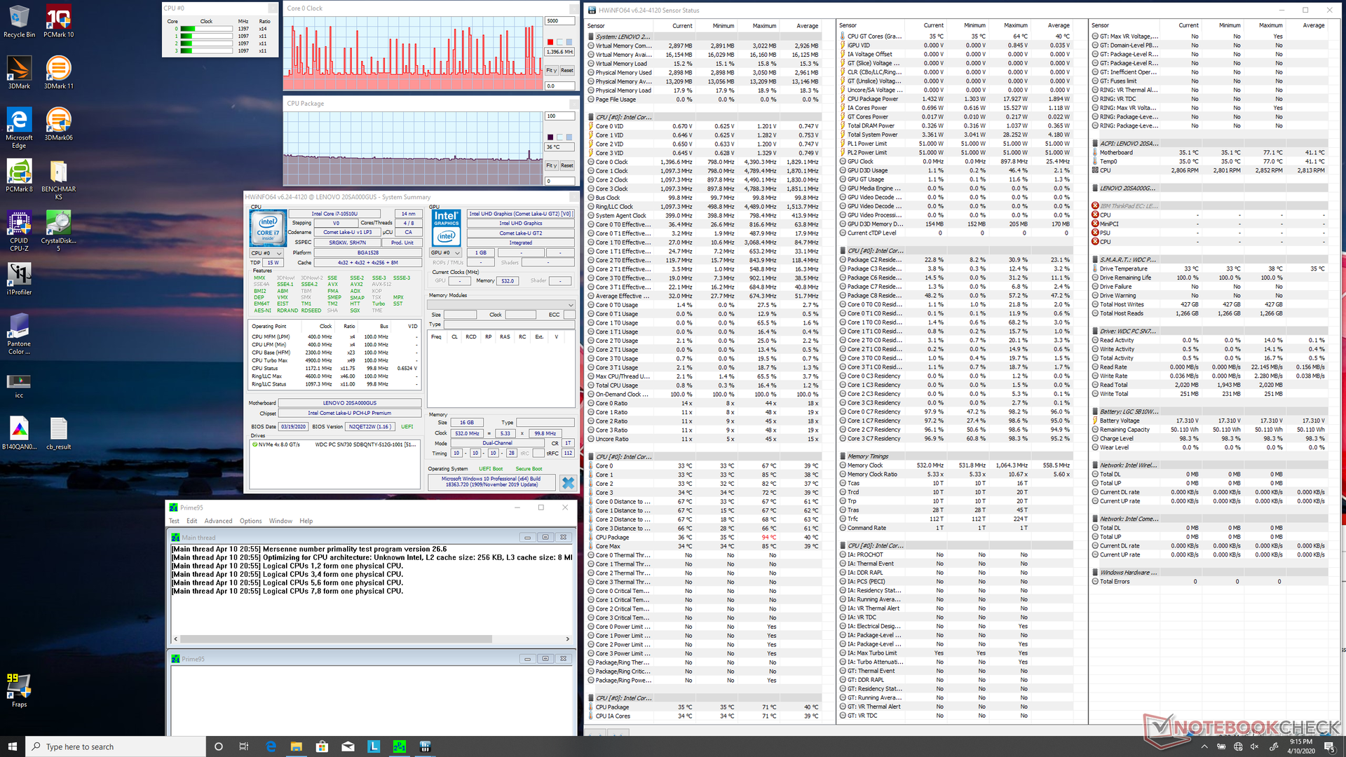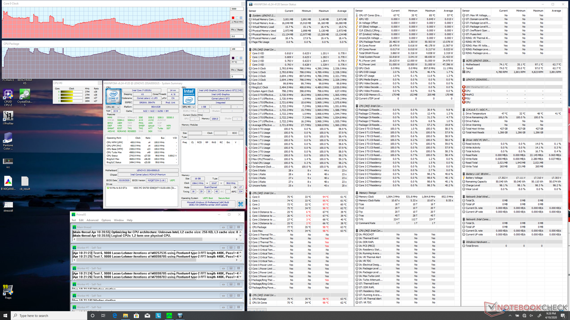Wir versetzen das System in eine Stresssituation, um etwaiges Throttling oder Stabilitätsprobleme zu identifizieren. Unter Prime95-Last konnten wir wieder ein Schwanken der CPU-Taktraten feststellen. Die Taktraten steigen zu Beginn auf 4,2 GHz und bleiben ein paar Sekunden stabil, bis eine Kerntemperatur von 97 °C erreicht wird. Danach schwanken die Taktraten ständig zwischen 2,0 GHz und 3,2 GHz, während die Kerntemperatur zwischen 69 und 92 °C fluktuiert. Dieses Verhalten ist anders als bei den meisten Laptops, bei denen die CPU-Taktraten und -Temperaturen unter solch hoher Belastung stabil bleiben. Diese Strategie ermöglicht es Lenovo, kurzfristig mehr Leistung aus der CPU herauszuholen, hat aber den Nachteil instabiler Taktraten.