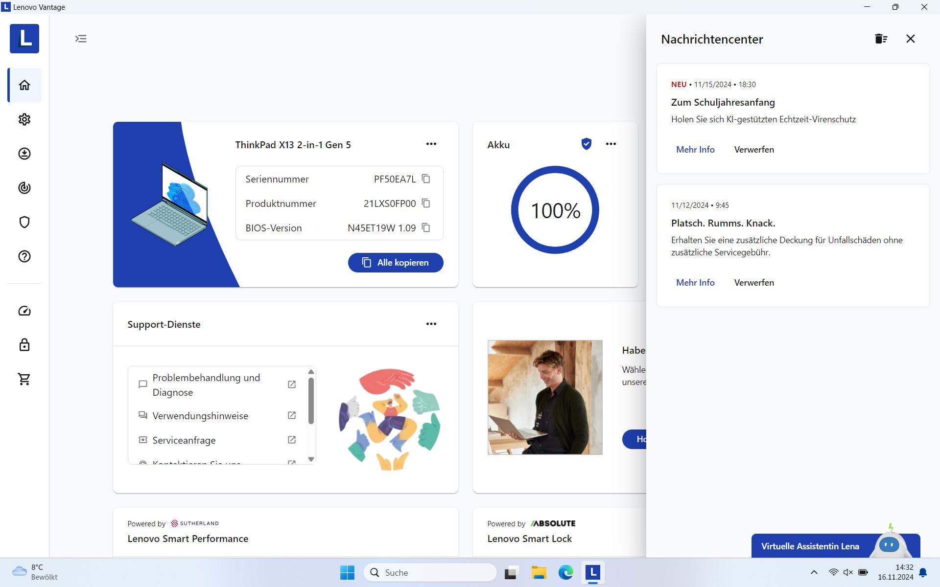 Umso erstaunlicher finden wir, dass wir dennoch viele Verbesserungsvorschläge haben und auch Kritik üben müssen, zumal das Modell mit 2.000 Euro nicht gerade preiswert ist. Schon beim Vorgänger schrieben wir, dass die Leistung beinahe niedriger ist als bei dessen Vorgänger. Und auch das aktuelle Modell kann sich leistungstechnisch kaum vom Vorgänger absetzen, abgesehen von der verbesserten KI-Leistung gibt es also eine Stagnation über jetzt schon zwei Generationen. Der Touchscreen geht zwar in Ordnung, bietet aber nur 300 Nits und deckt nur sRGB ab, es gibt aber mittlerweile wieder eine leicht hellere Variante. Und dass "bis zu Wi-Fi 7" beworben, aber (für Consumer?) gar nicht verfügbar ist, ist mindestens fragwürdig. Apropos: Wir hoffen sehr stark, dass Lenovo demnächst wieder seine Vantage-Software entschlackt, denn die darin enthaltene Werbung nimmt langsam Überhand, echte Leistungseinstellungen fehlen indes. Und nach wie vor kann die Temperatur zum Problem werden, wie die SSD-Drosselung trotz großem Kupferkühlkörper zeigt.