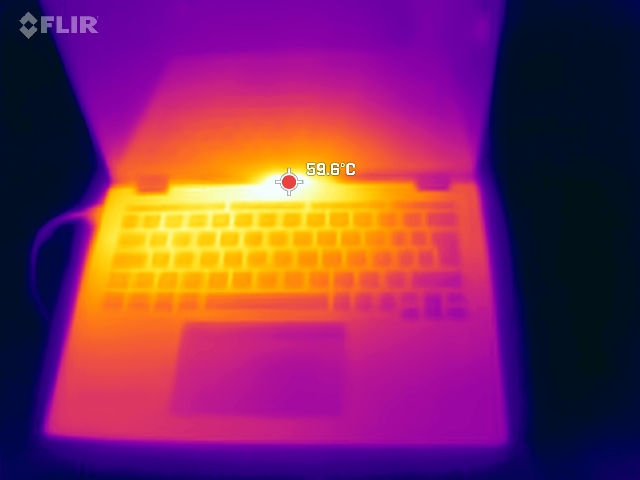 Die geringe Geräuschkulisse wird in Stresssituationen aber durchaus mit einer hohen Oberflächentemperatur erkauft. Wir messen bei unserem Stresstest Hot Spots von bis zu 60 °C an der Oberseite zentral zum Display hin, das ist heißer als alle Konkurrenten. Und auch die linke Tastaturhälfte erwärmt sich recht stark. Die rechte Seite bleibt spürbar kühler als die linke.