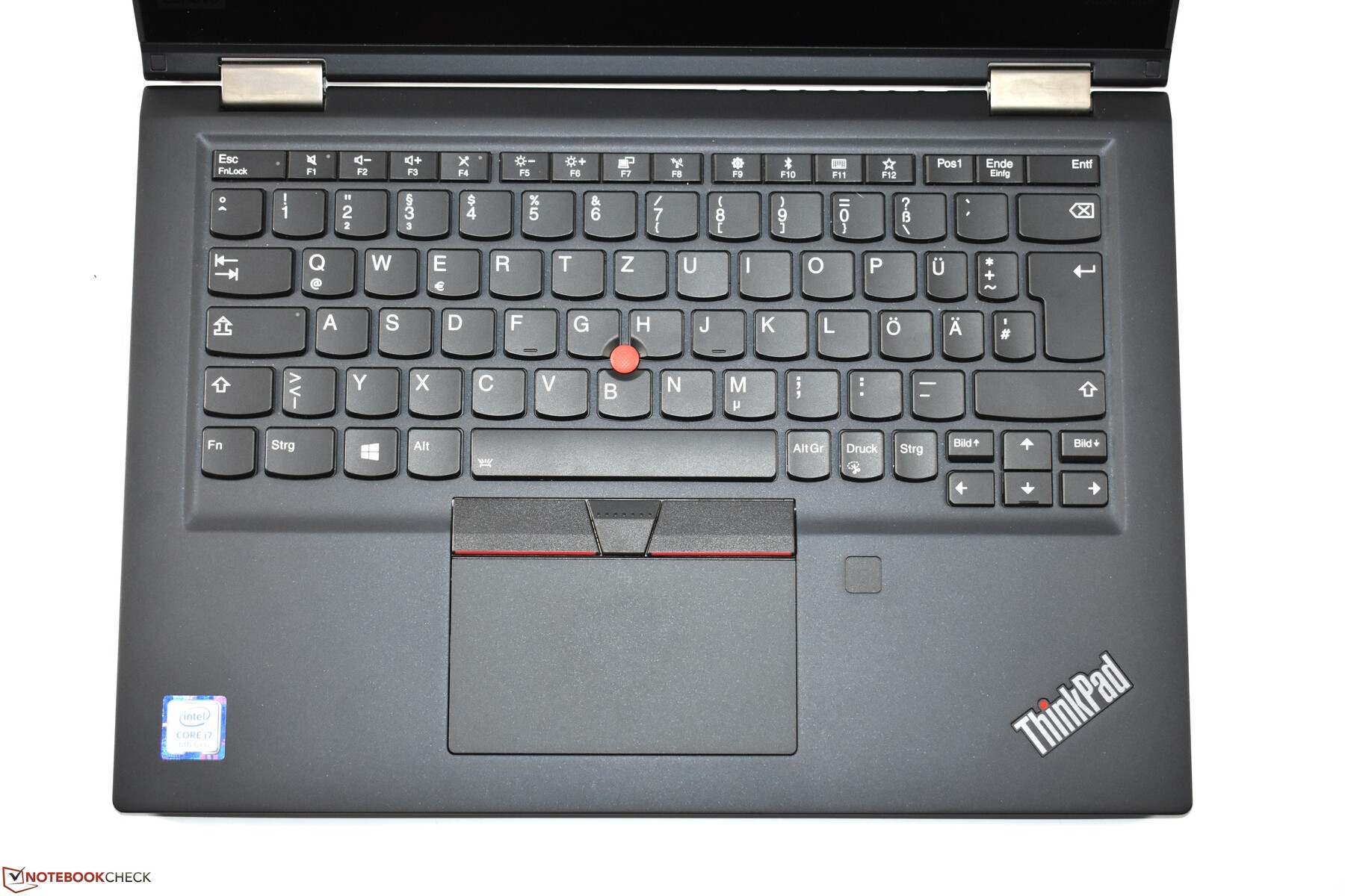 Der TrackPoint-Pointing-Stick ist wie bei (fast) allen ThinkPads zwischen den Tasten B/G/H verbaut. Er hat eine rote Kappe aus Gummi. Das TrackPoint-Modell bei unserem Testgerät wurde von Synaptics hergestellt. Mit dem TrackPoint lässt sich der Mauszeiger präzise und schnell verschieben, da man die Hände nicht von der Tastatur nehmen muss, um den Pointing-Stick zu bedienen. Die drei zugehörigen Tasten unterhalb der Tastatur und oberhalb des Touchpads haben einen kurzen Hub und einen knackigen Druckpunkt. Sie funktionieren gut und sind eher leise, wobei die rechte TrackPoint-Taste bei unserem Modell interessanterweise minimal lauter als die linke TrackPoint-Taste ist.