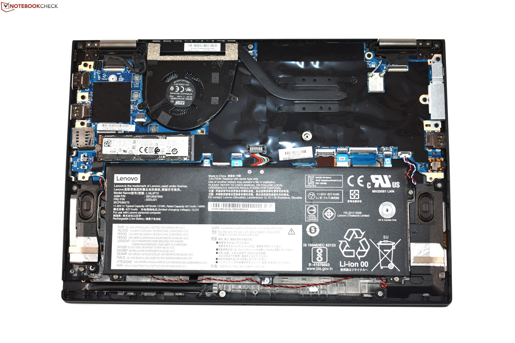 Glücklicherweise lässt sich das Lenovo ThinkPad X390 Yoga ziemlich einfach öffnen. Man muss acht Schrauben lösen (diese bleiben im Gehäuse stecken) und kann dann mit einem Spudger oder einem ähnlichen Werkzeug die Clips an der hinteren Kante des Gehäuses lösen, was in diesem Fall ohne größere Probleme geht. Danach hat man Zugriff auf alle internen Komponenten. Man kann zum Beispiel den Lüfter reinigen, die Wärmeleitpaste erneuern oder den Akku austauschen, der lediglich verschraubt ist.