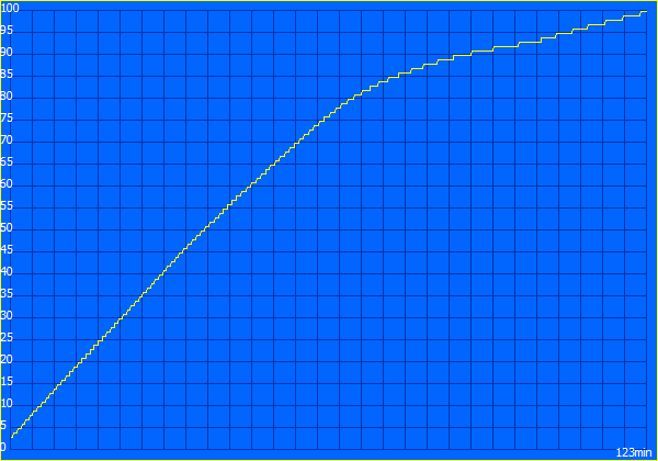 Der vollständige Ladevorgang benötigt bei eingeschaltetem Gerät etwas mehr als zwei Stunden; 80 % der Kapazität stehen nach ~64 Minuten wieder zur Verfügung.