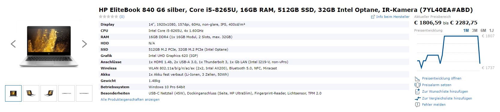Etwas ähnliches passierte beim HP Elitebook 840 G6 mit i5. 16 GB RAM und 512-GB-SSD: Am 18.03.2020 musste man für dieses Modell mindestens 1.745 Euro bezahlen, einen Tag später war der Preis auf 1.806 Euro geklettert. Seid gestern ist der Preis wieder auf den Ursprungswert gefallen.